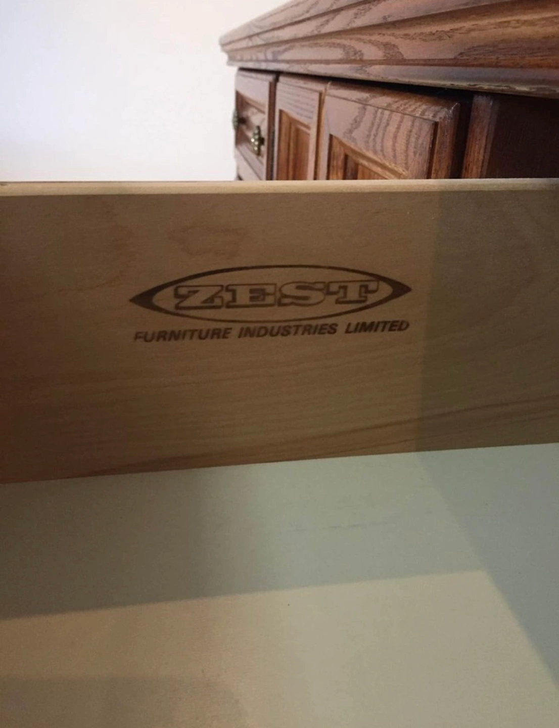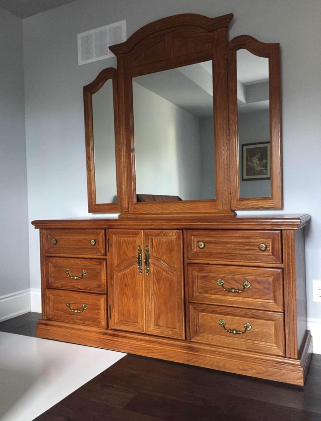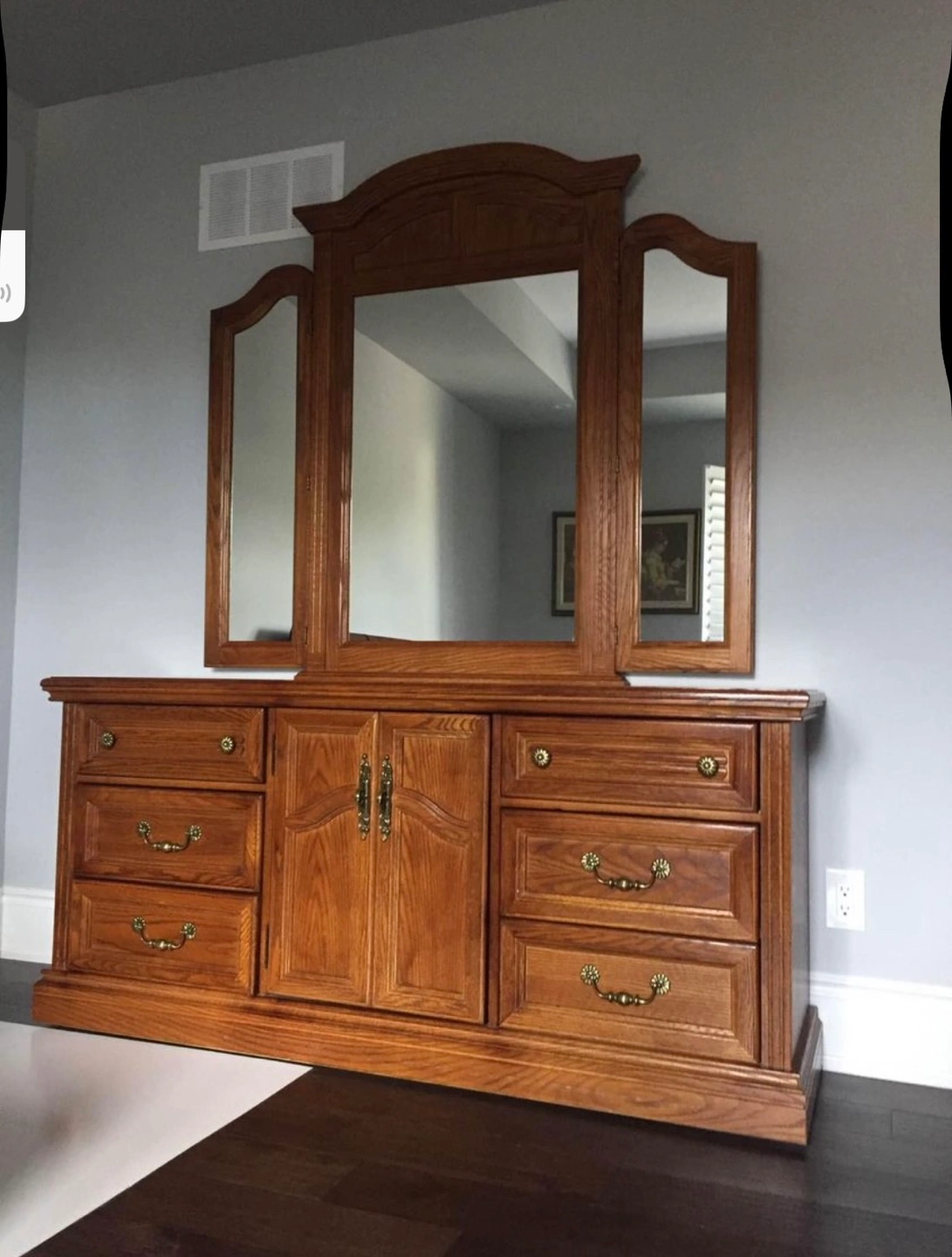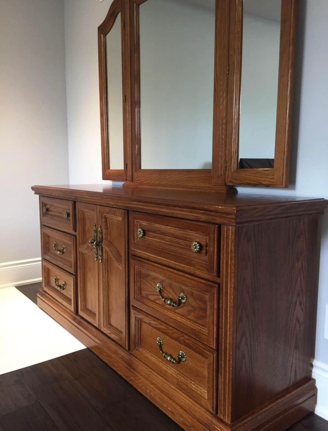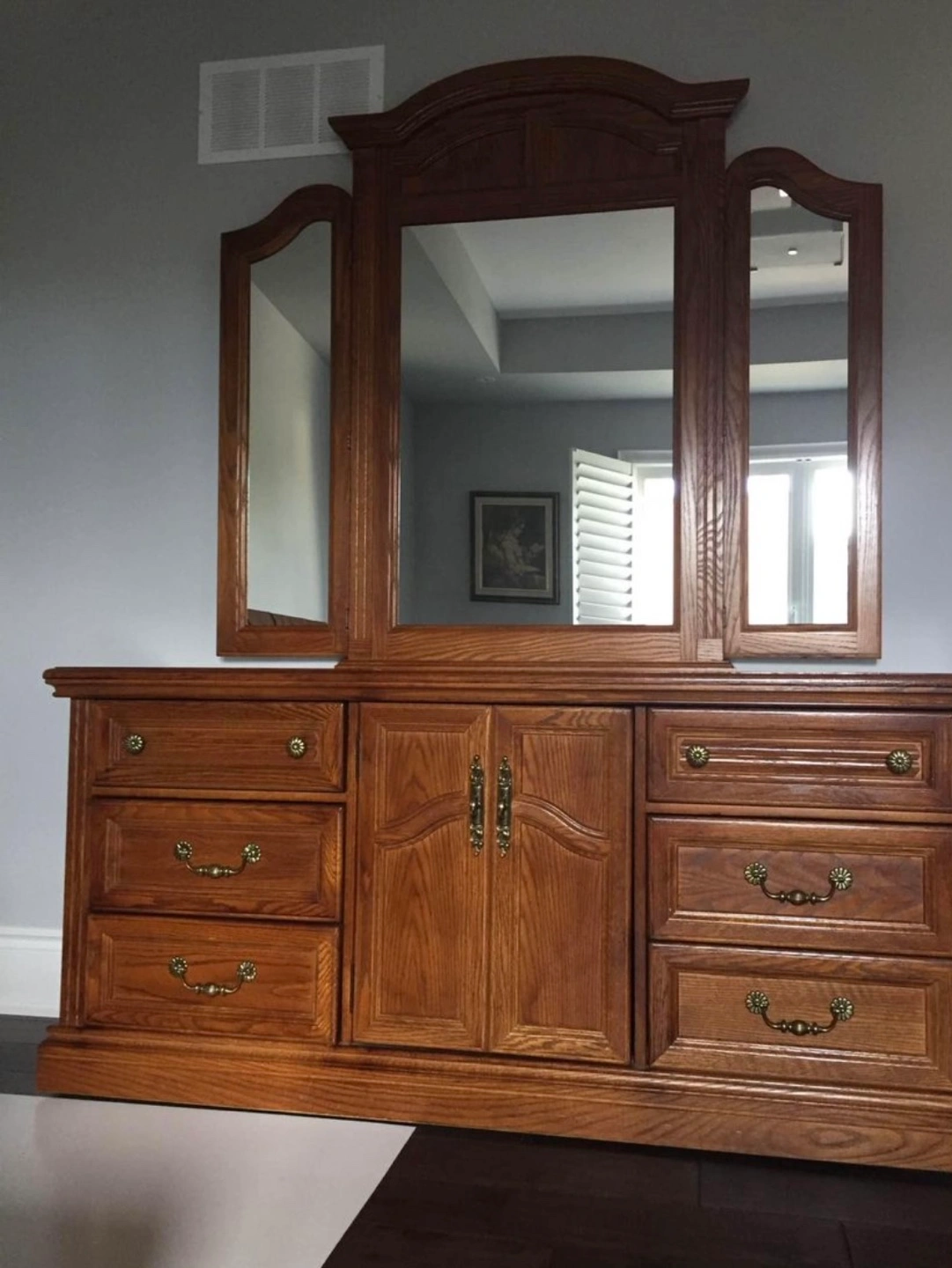 ZEST furniture made in Canada Wood vanity with three-piece swivel mirror. Six drawers, one door Gold-toned hardware. It doesn’t have any scratches If instead I have a matching 2 night tables. Must see, we are moving Give me a reasonable offer.