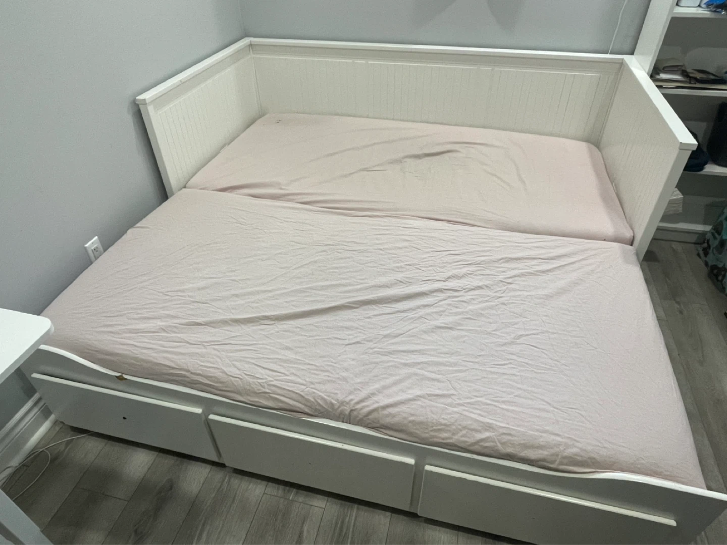 White daybed with three under-bed storage drawers. A small chip is present on the front right corner. Perfect for a guest room or smaller living space! Comes with 2 mattresses! Price is negotiable . Need it sold as soon as possible