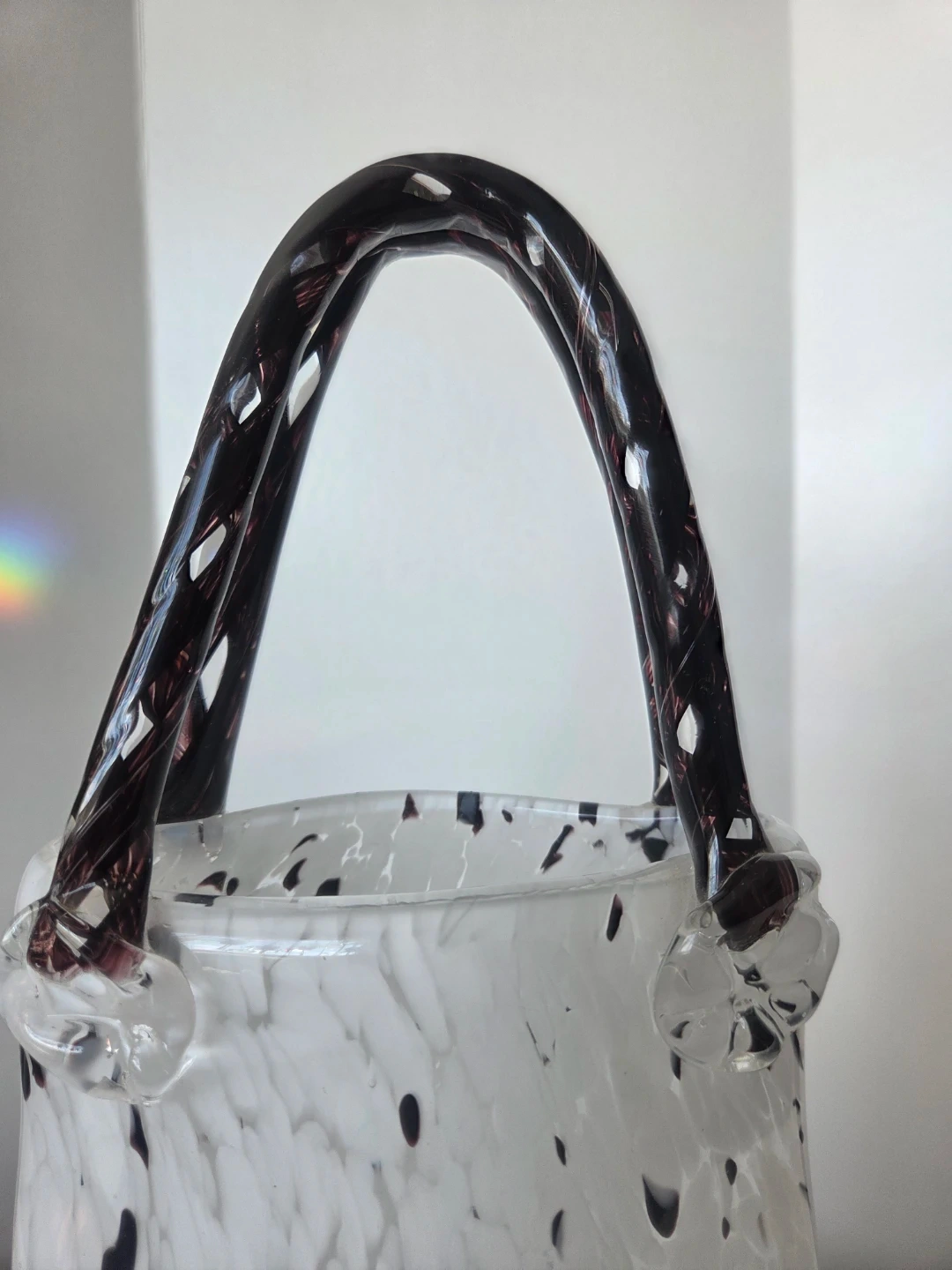 This unique glass vase is designed to resemble a handbag, with a white and black speckled pattern. It features a dark-coloured handle and clear glass accents. Its artistic design makes it a striking decorative piece for any home.