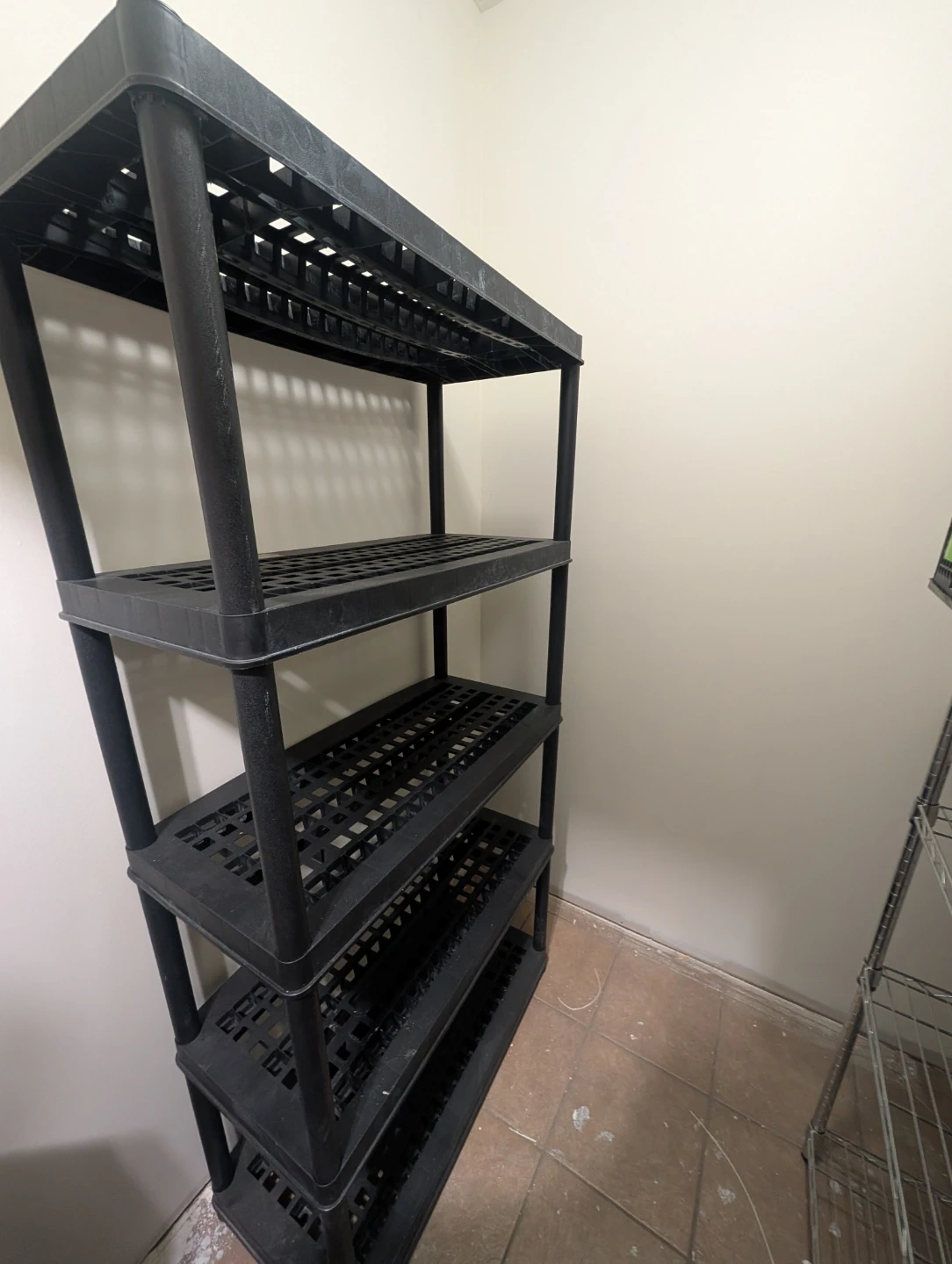 Black 5-tier plastic shelving unit for storage. It's a sturdy, modular unit made of durable plastic. Perfect for organizing garages, basements, or workshops. Holds a good amount of weight!