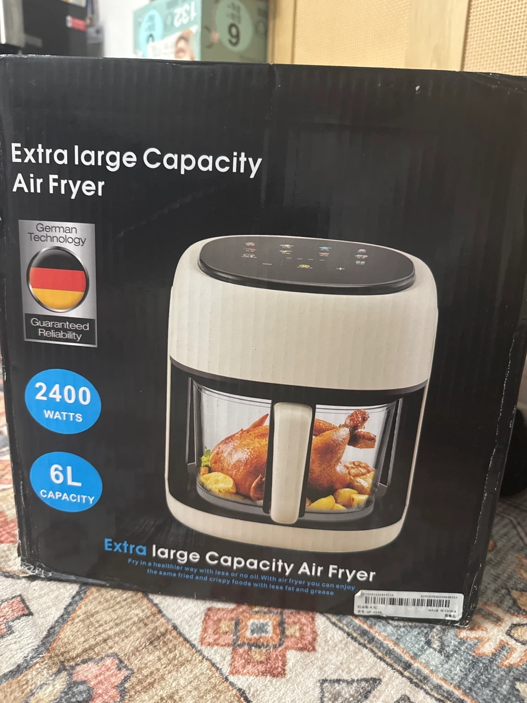 Extra large capacity air fryer with 6L capacity and 2400 watts of power. Features German Technology for guaranteed reliability. Fry food with less fat and grease. Includes original box.