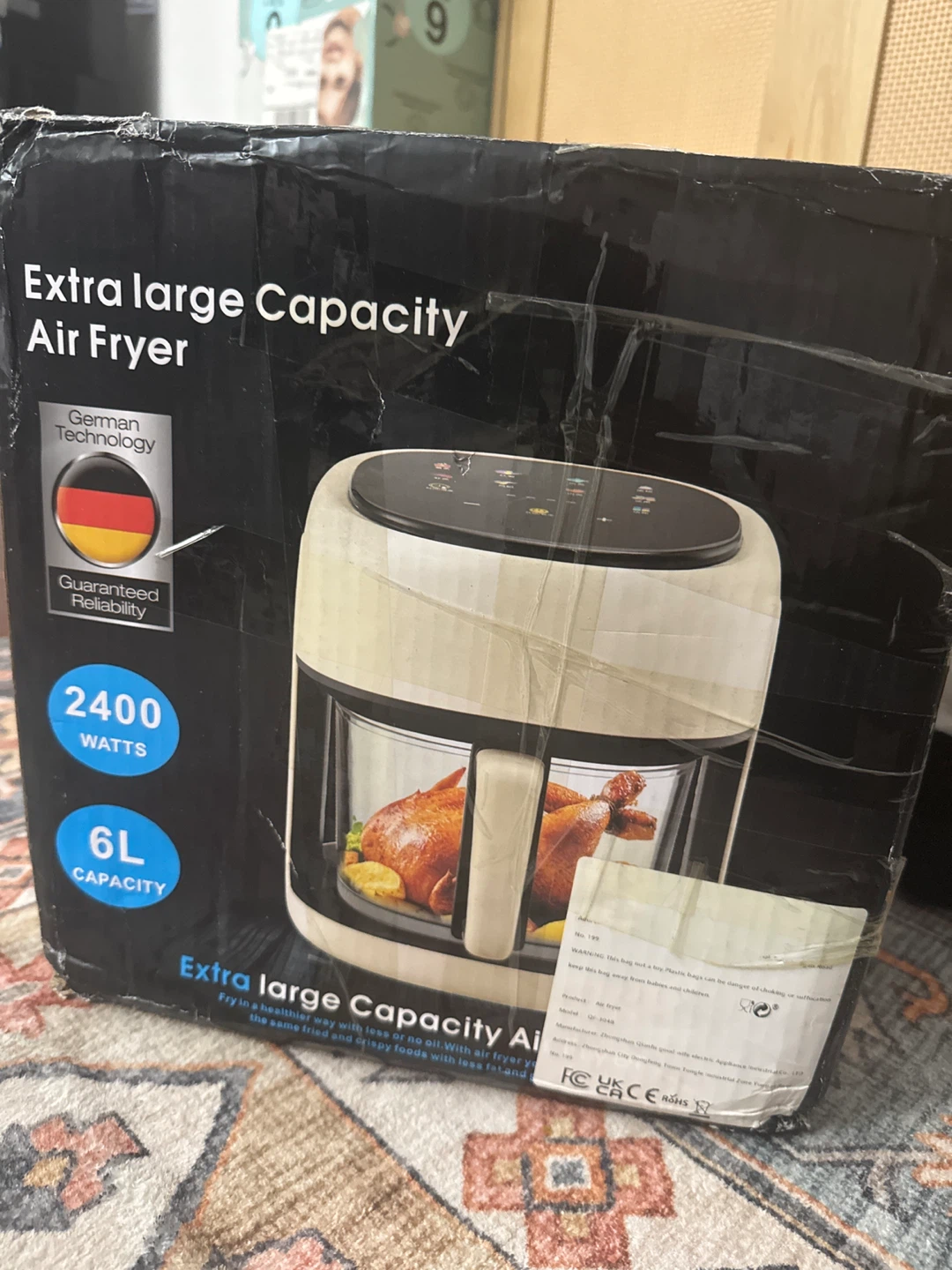 Extra large capacity air fryer with 6L capacity and 2400 watts of power. Features German Technology for guaranteed reliability. Fry food with less fat and grease. Includes original box.