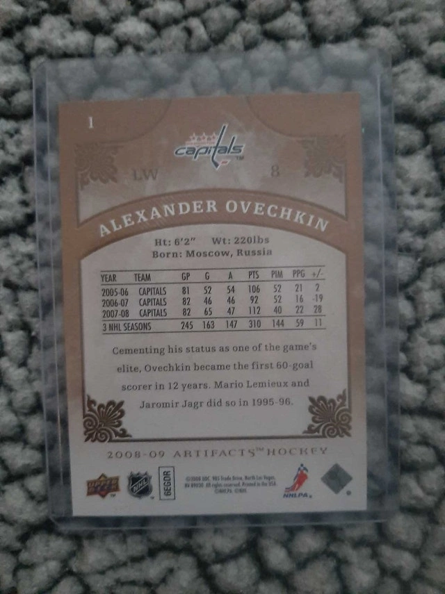 I'm offering an Alexander Ovechkin 2008-09 Artifacts hockey card. This card showcases Ovechkin during his early years with the Washington Capitals, highlighting his impressive stats from the 2005-2008 seasons. It is a great card for any hockey fan or collector.