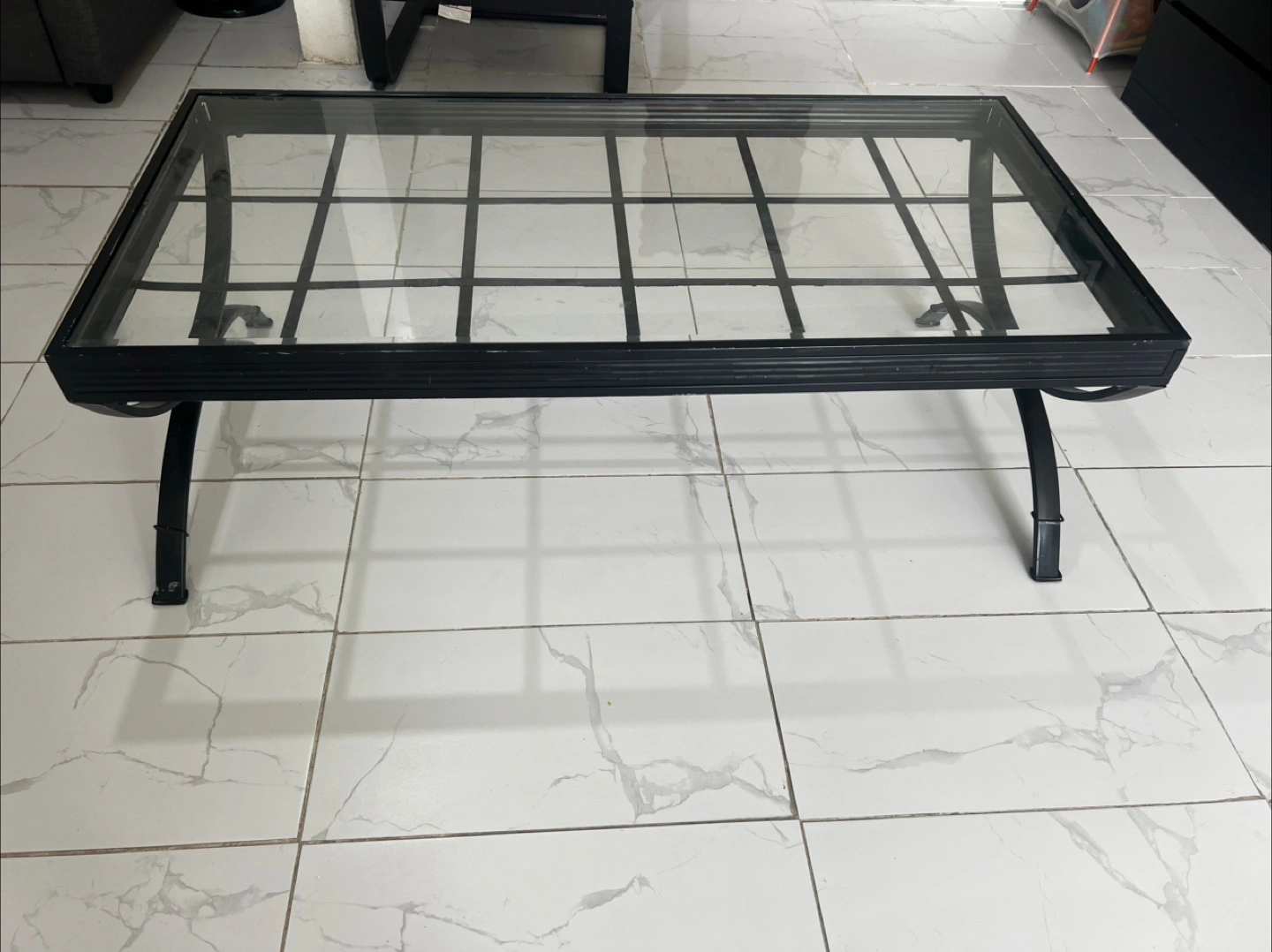 Rectangular coffee table featuring a glass top with a metal frame and legs. The glass has a grid pattern underneath for support. It's a stylish piece for your living room!