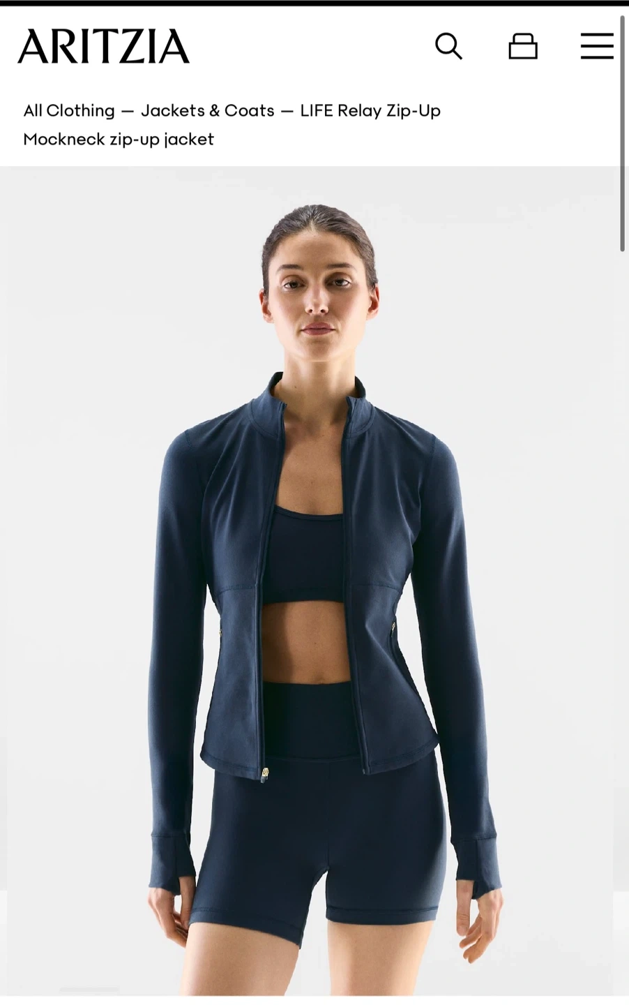 This is an Aritzia LIFE Relay Zip-Up mockneck jacket. It's a navy blue, long-sleeved zip-up jacket with a mockneck. Features include thumbholes and a zippered pocket.