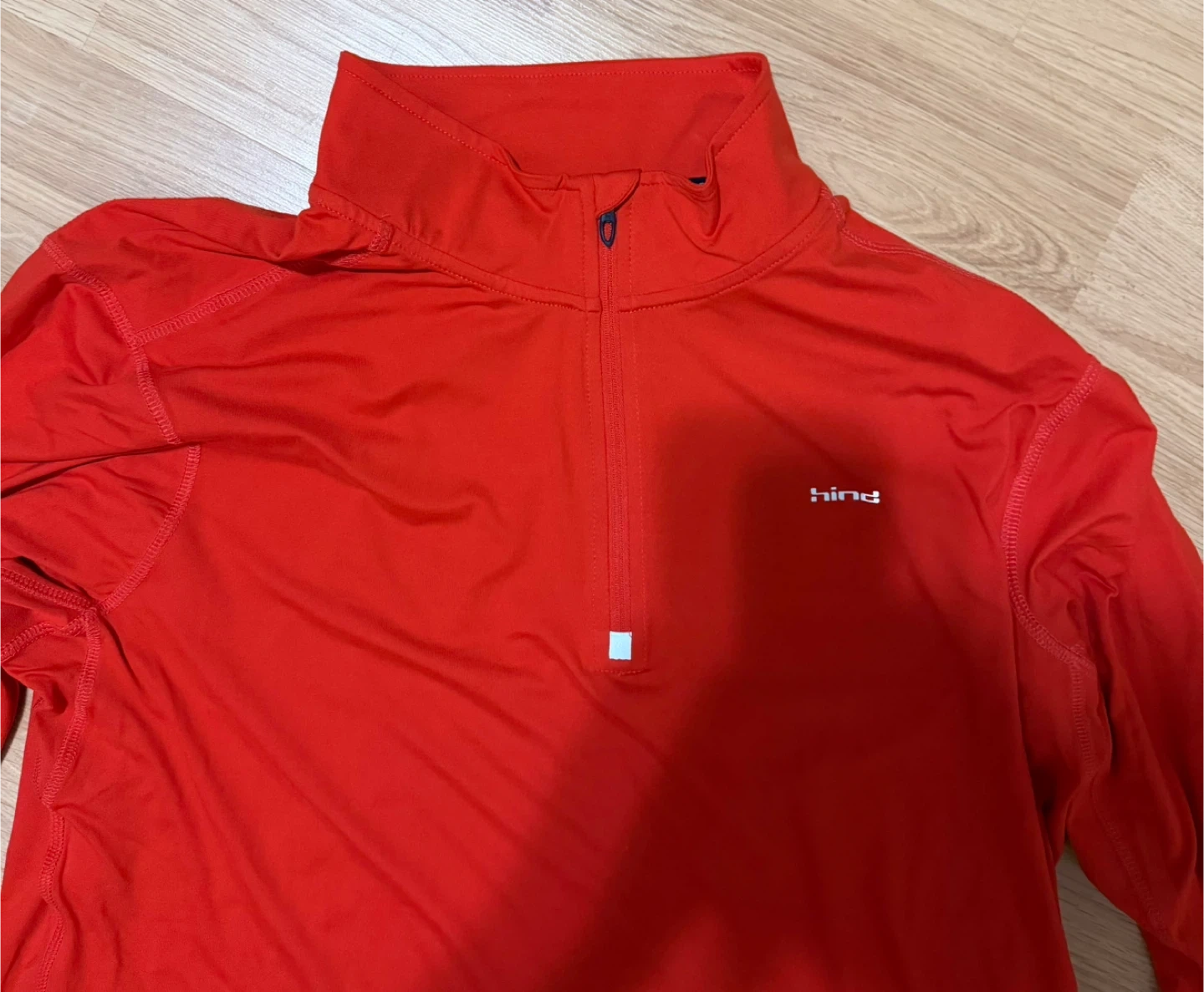 This red athletic shirt from Hind features a 1/4 zip neckline and long sleeves. It's made of 88% Polyester and 12% Spandex for a comfortable fit. Size XL.