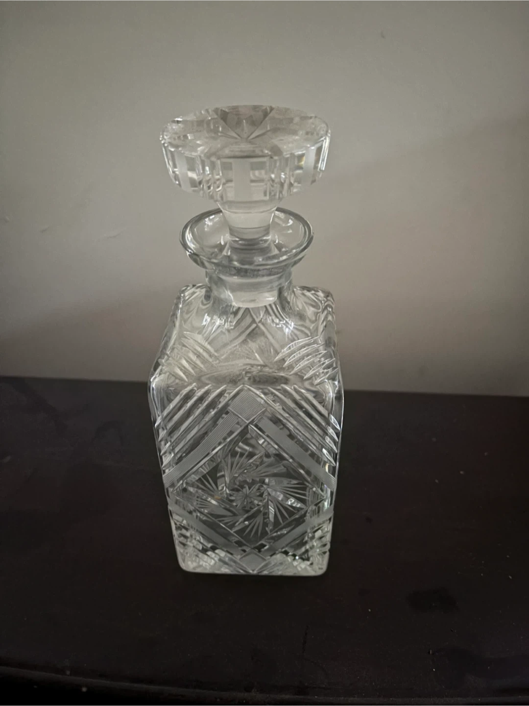 Selling a beautiful crystal decanter! It features a square shape with an intricate starburst pattern and a matching stopper. It would make a lovely addition to any home bar or collection