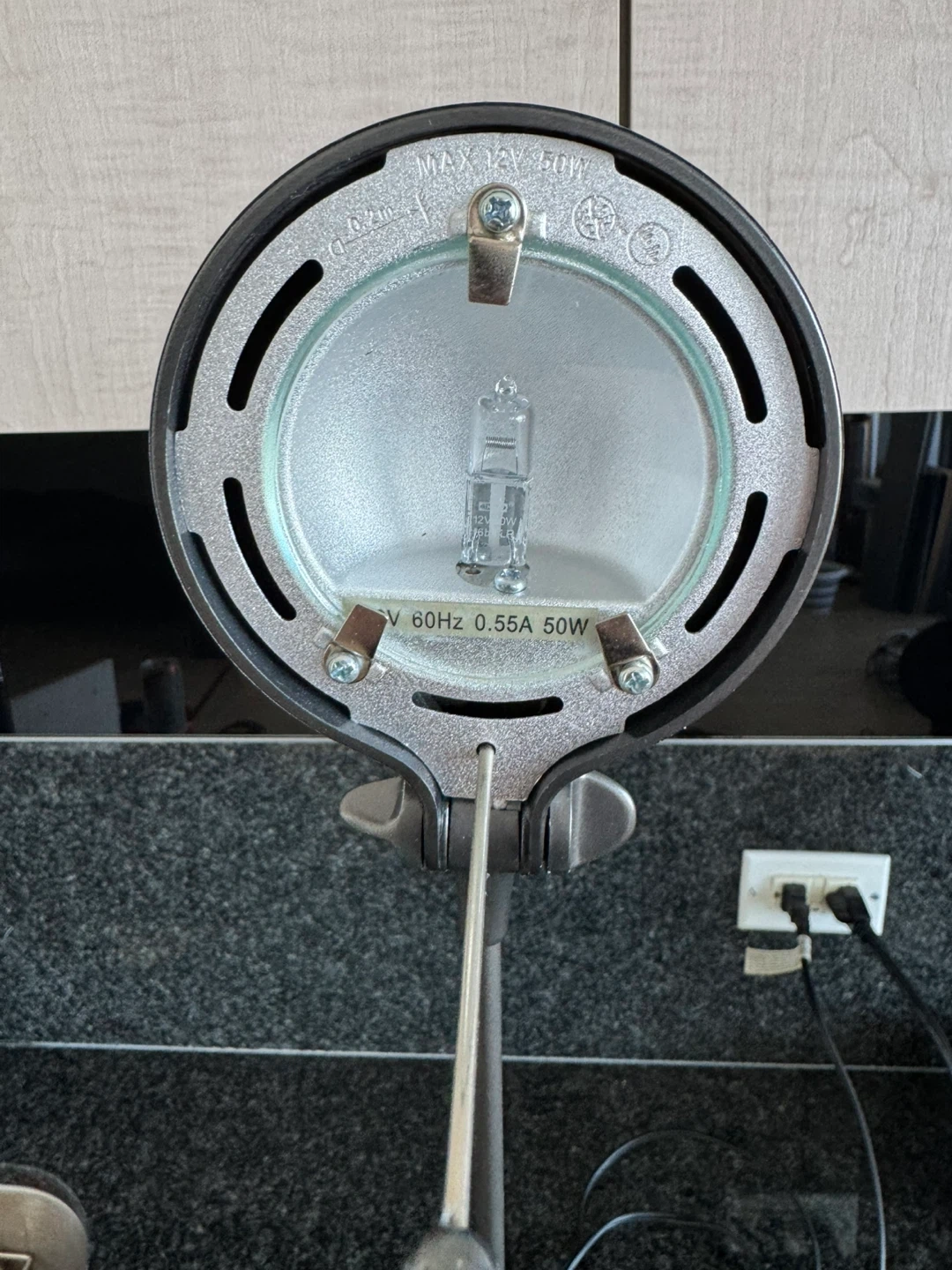 This sleek metal desk lamp offers adjustable lighting for your workspace. It's a dimmable halogen lamp, max 50W. It has a sturdy base and a flexible gooseneck for precise positioning. Great for focused tasks! Two power lights position