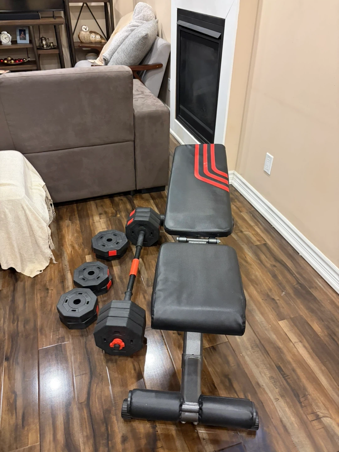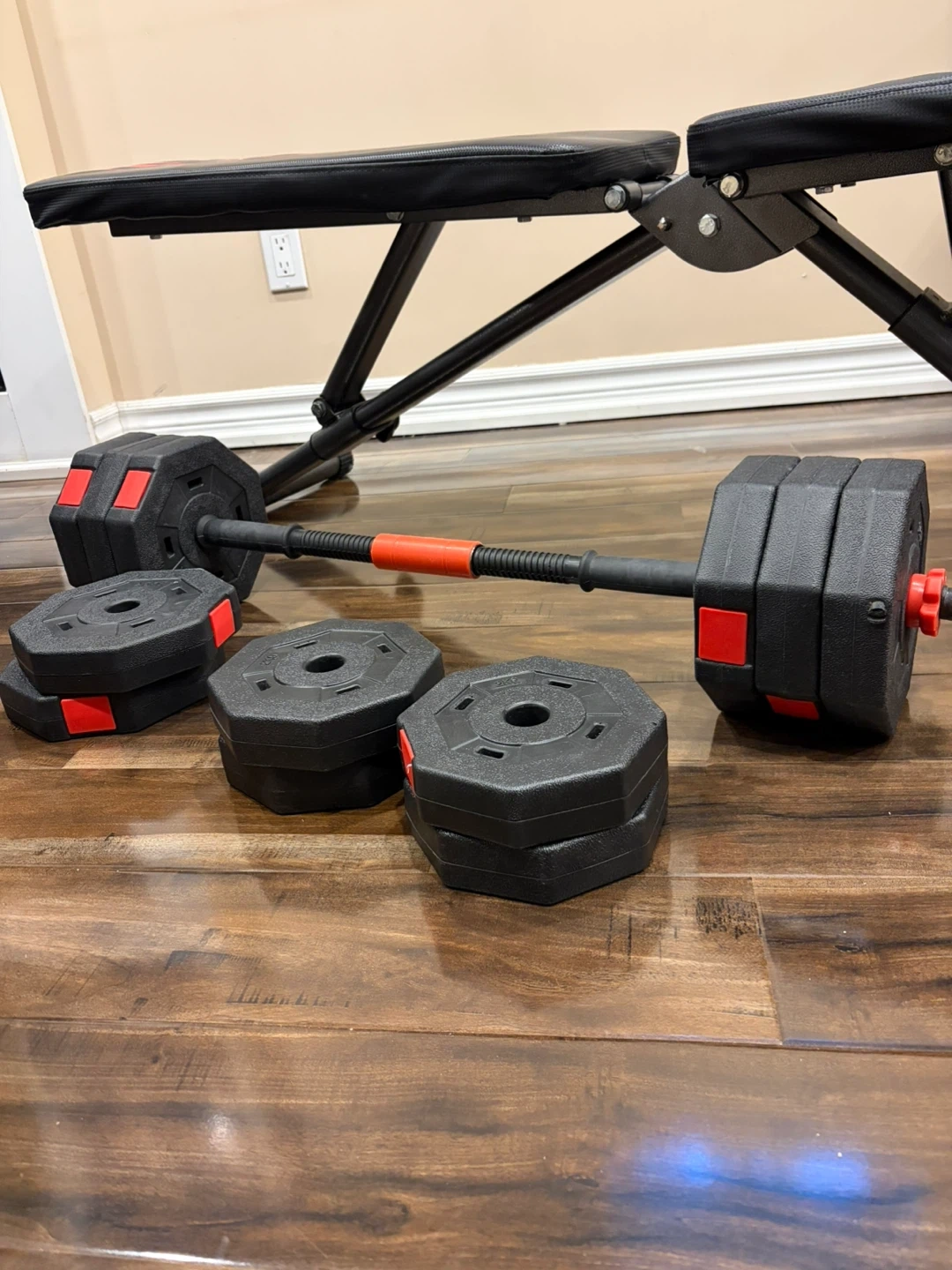 I lost the attachment that lets you turn the barbell into two dumbells, but I’ve see them on Amazon for cheap.