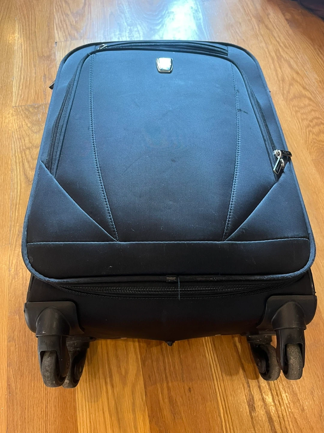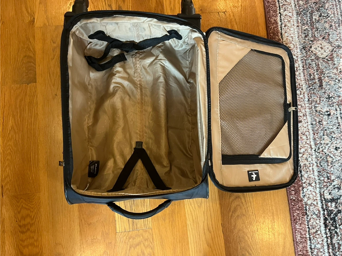 This is a black Atlantic carry-on suitcase with wheels. It features an expandable design and internal compression straps. The interior has a mesh zippered compartment on the lid. It has some wear and tear, but everything functions as intended.