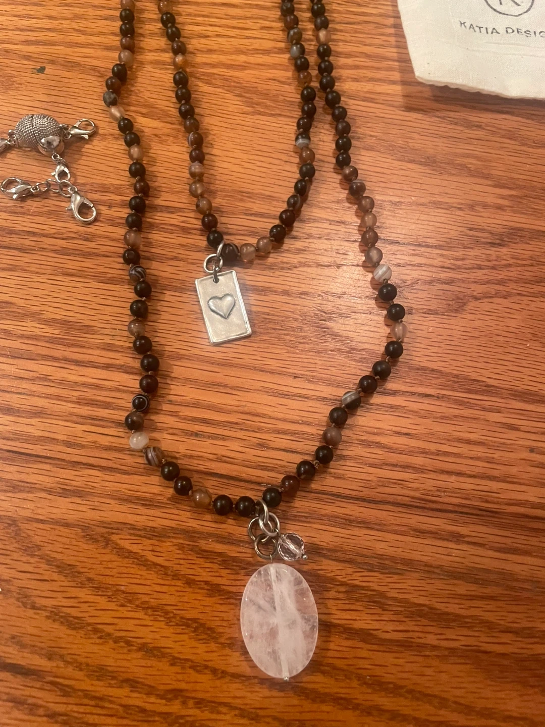 This Katia Designs necklace features a beaded chain with a heart charm and a natural stone pendant. It comes with a small drawstring pouch for storage. The clasp is magnetic for easy wear.