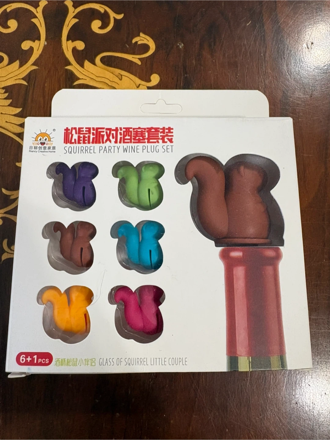 These adorable squirrel wine plugs come in a set of six, plus one larger one for the bottle. They're made of silicone to keep your wine fresh. Fun for parties and gatherings!