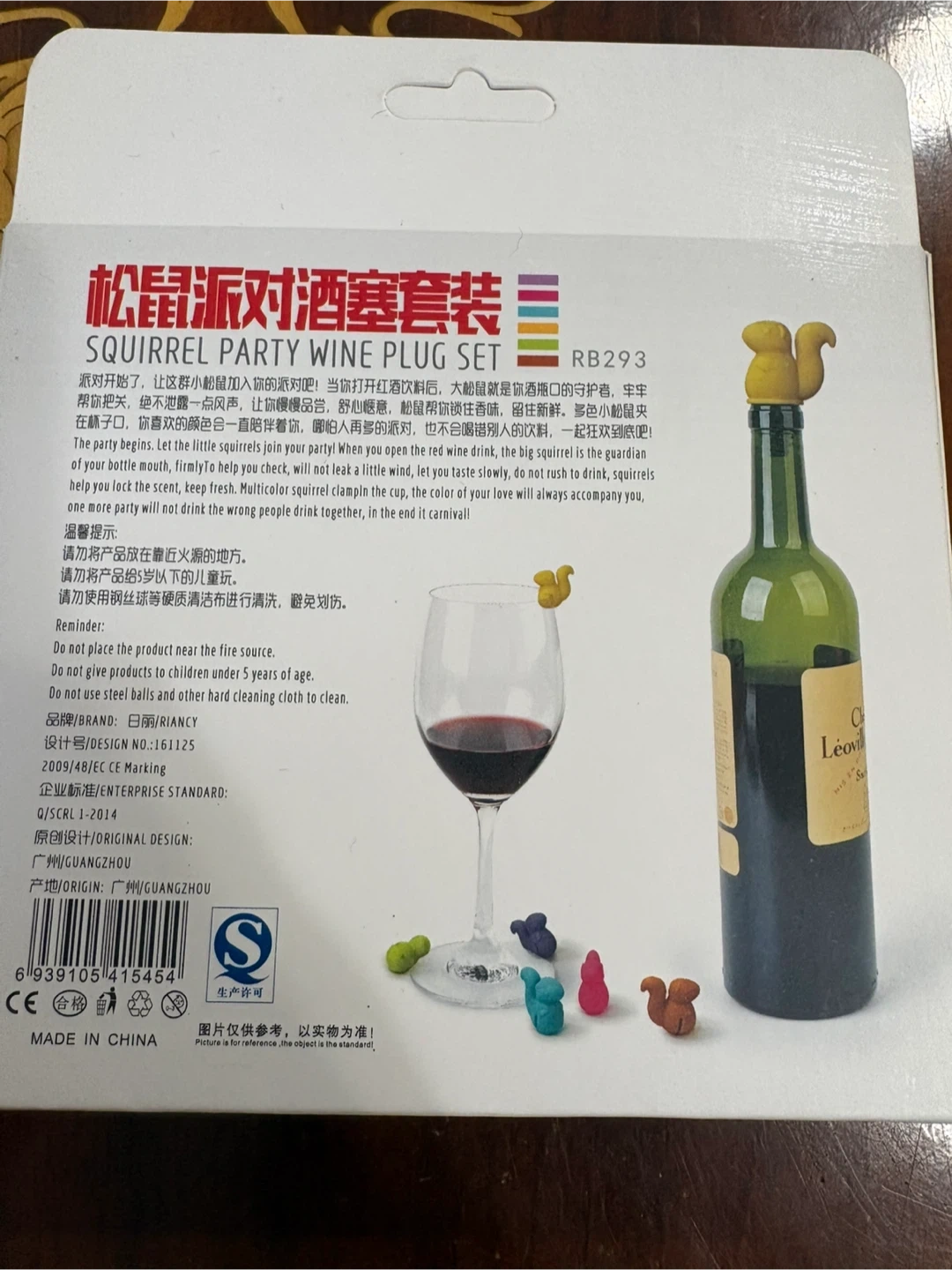 These adorable squirrel wine plugs come in a set of six, plus one larger one for the bottle. They're made of silicone to keep your wine fresh. Fun for parties and gatherings!