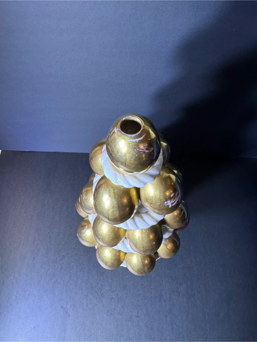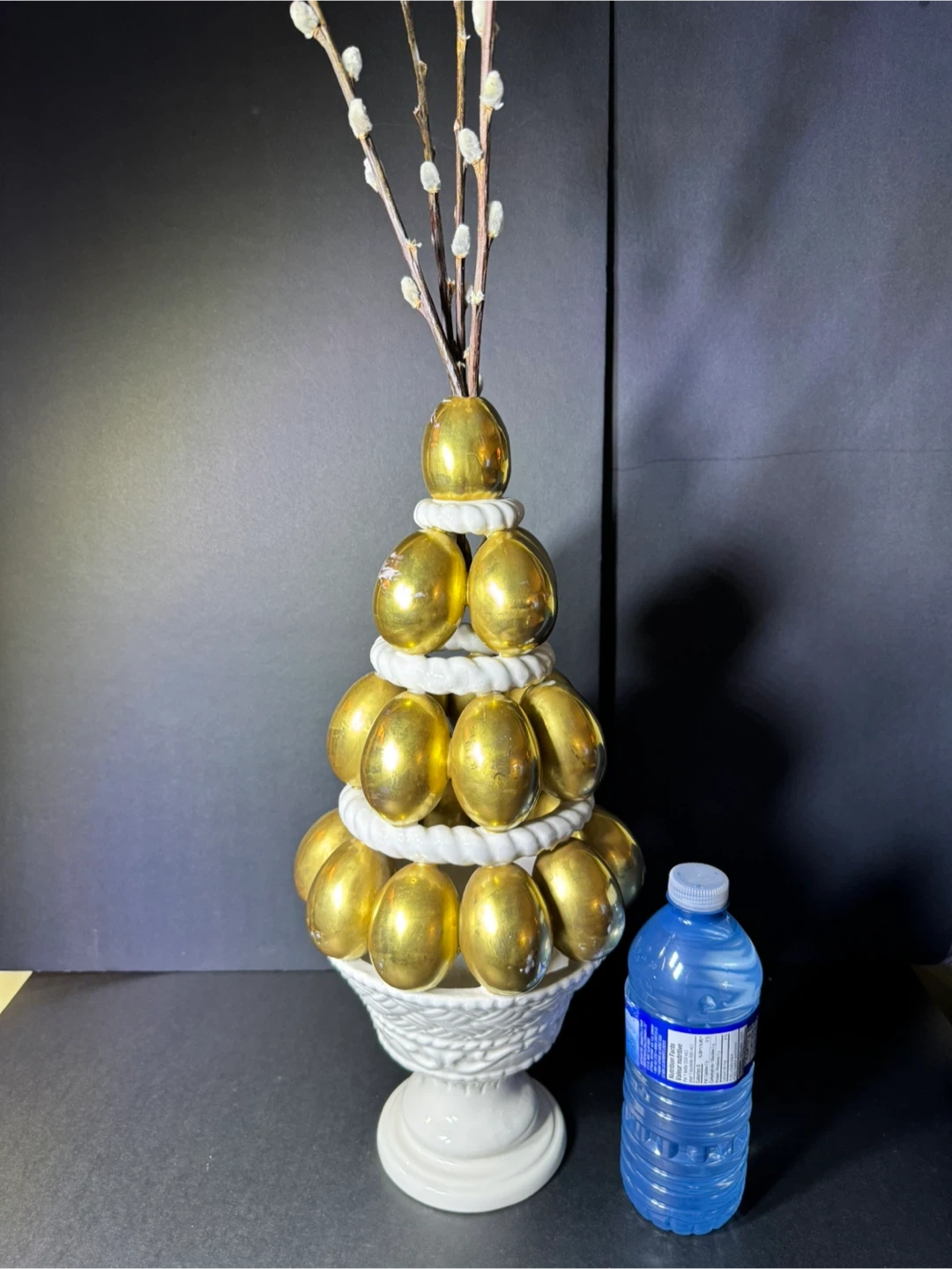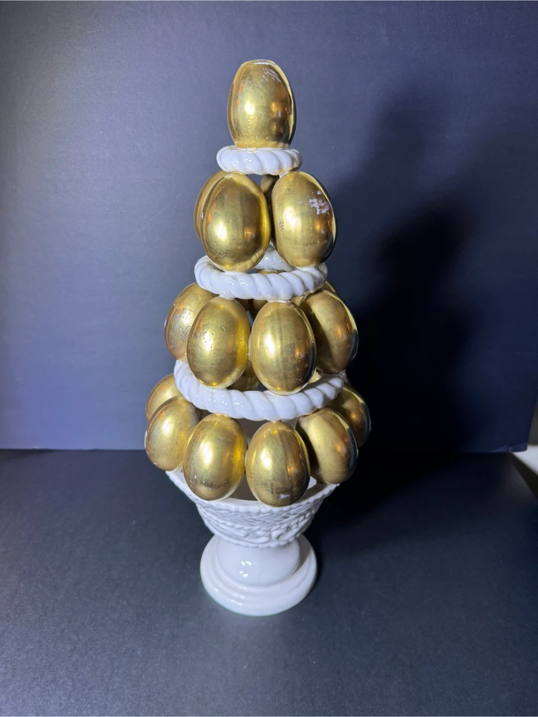 This vintage decorative piece features a white ceramic base and a tiered arrangement of golden eggs, accented with white rope detailing. It's a unique decorative item that adds a touch of elegance to any space. The base is marked "Paul's Italy" and includes a model number 564/16672. This piece is perfect for display during spring or holiday seasons.High 17 inches