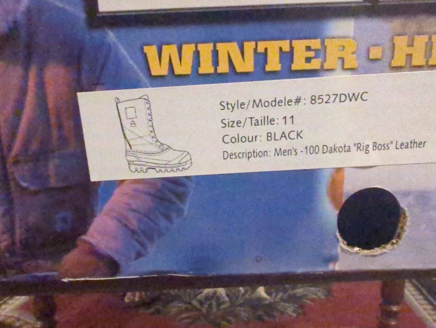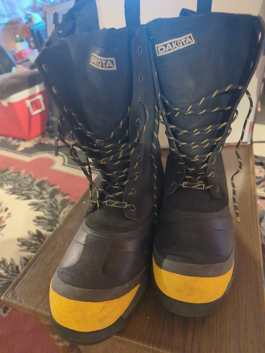 Dakota men's "Rig Boss" winter boots. Black colour with yellow accents. Size 11. Composite toe construction. Keeps your feet warm with -100 C comfort rating. Laced up with durable construction. Basically brand new only use once or twice. If interested please contact me at 587-709-0376.