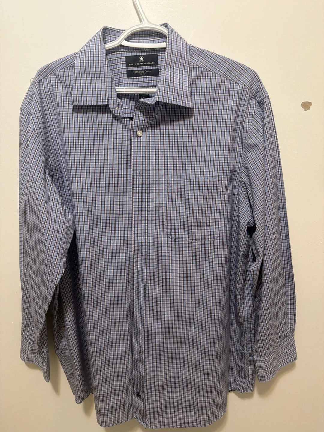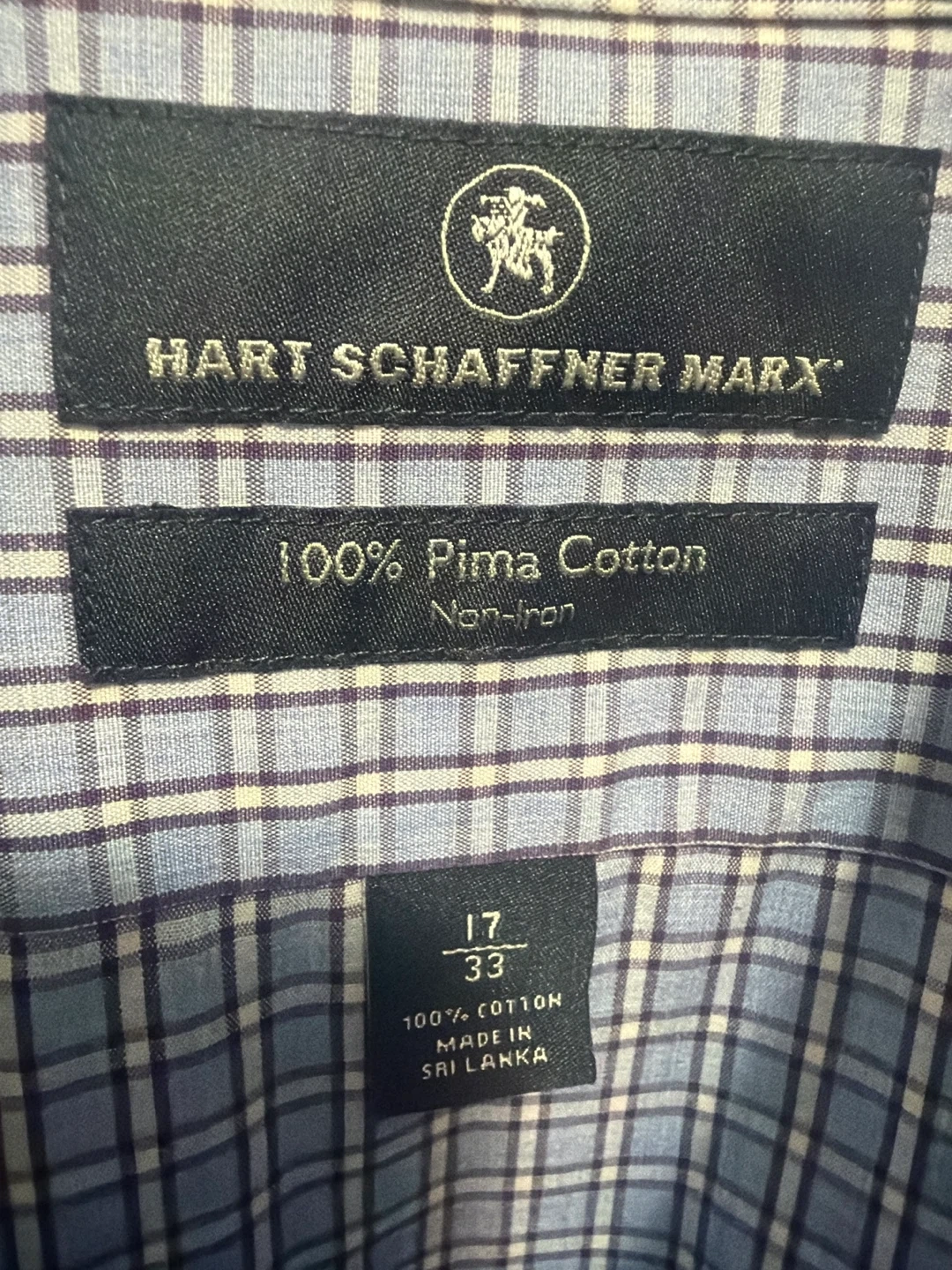 Hart Schaffner Marx dress shirt made from 100% Pima Cotton. It's a non-iron button-up with a plaid pattern. Collar size 17 and sleeve length 33.