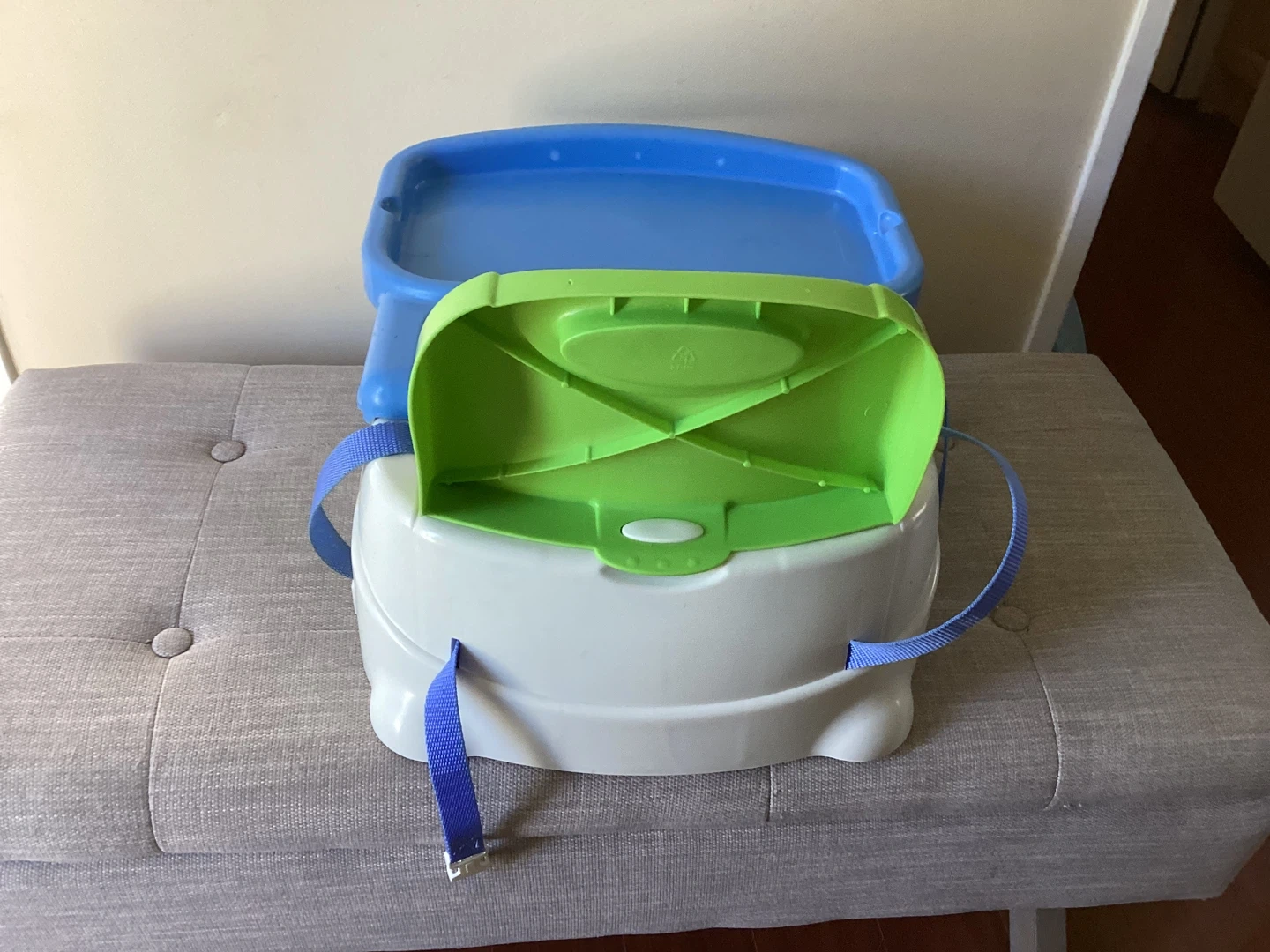 This is a Fisher-Price booster seat with a blue tray and green insert. It has straps for securing it to a chair. It's a handy option for meal times on the go or at home. Suitable for toddlers needing a bit of extra height at the table.