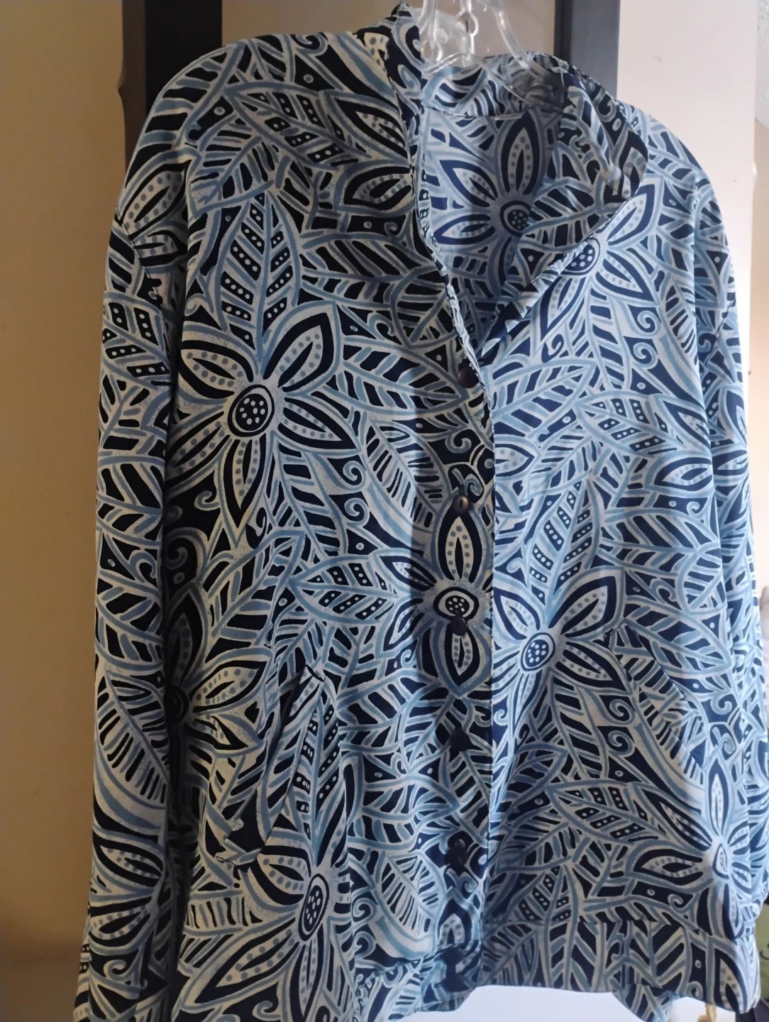 Featuring a vibrant blue and white floral and leaf pattern. The material feels light and breathable. It's great for casual wear or dressing up for a day out!
