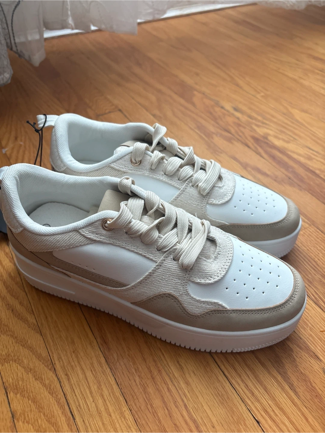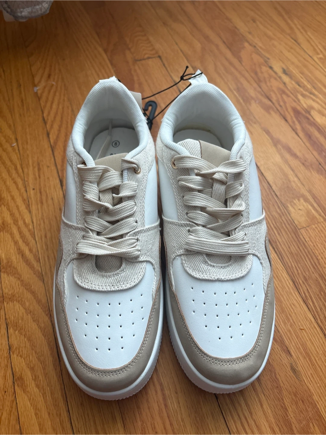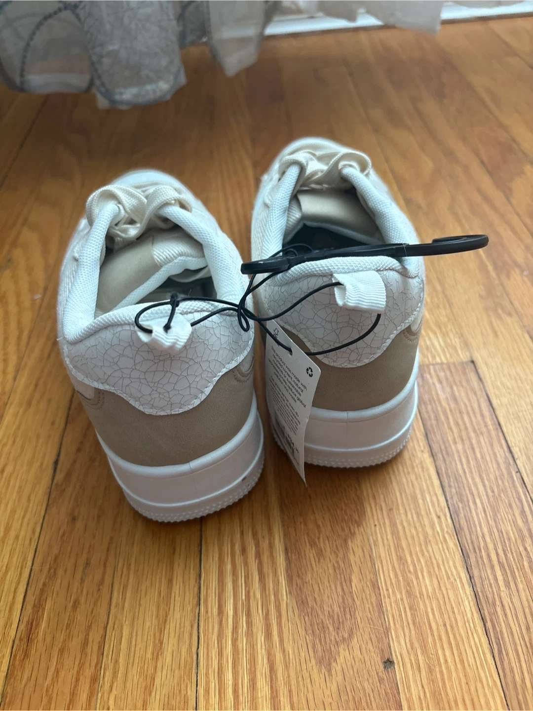 Brand new white and tan lace-up sneakers. Comfortable and stylish design, perfect for everyday wear. Size is 8.