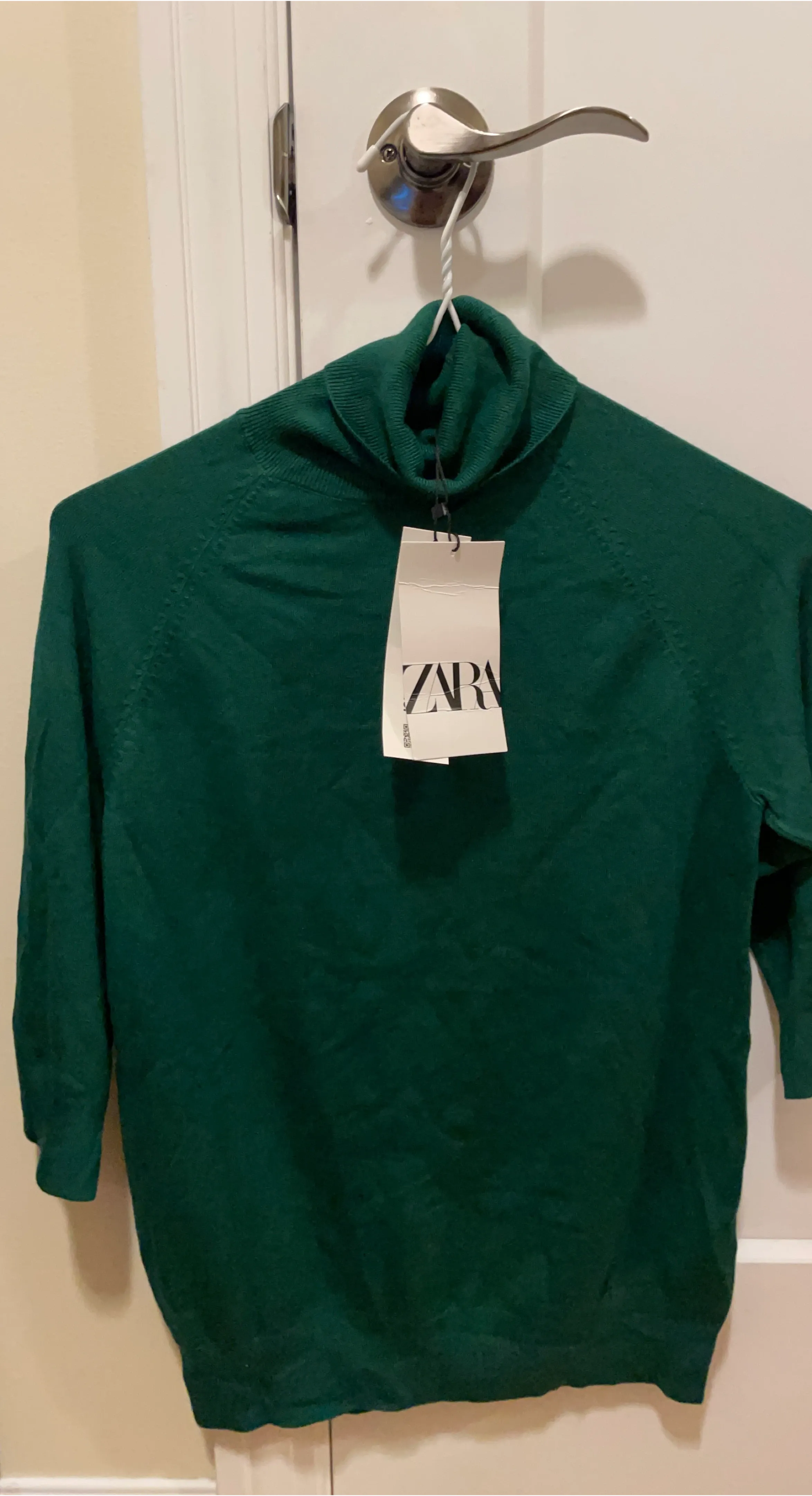 This is a ZARA green turtleneck sweater. It's a size medium and made of a soft knit material. It's perfect for keeping warm on cooler days!
