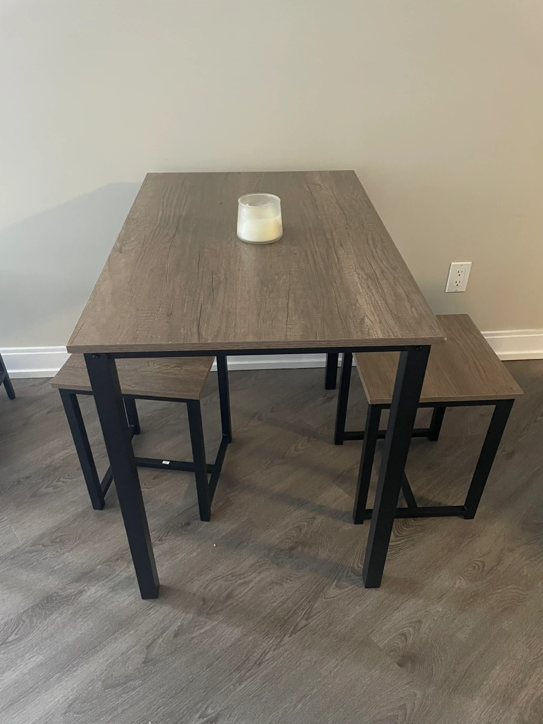 This compact dining set includes a table and two stools. It features a wood-look tabletop with a black metal frame. Perfect for smaller spaces or as a breakfast nook set!