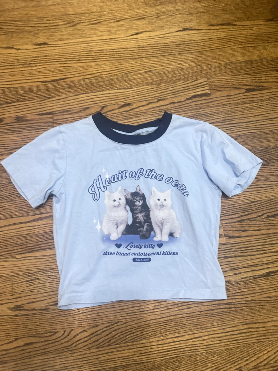 A cute light blue t-shirt featuring a 'Heart of the Ocean' design with three adorable kittens and the text 'Lovely kitty three brand endorsement kittens'. Perfect for any cat lover!