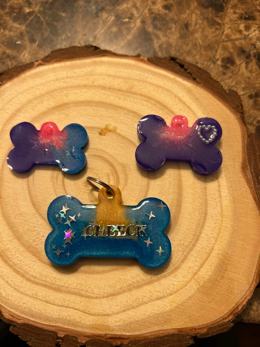 Set of handmade resin pet ID tags with charms and personalized names. Includes two pot-shaped tags labelled 'Monkey' and 'Daisy', and three bone-shaped tags with the name 'Cheech' on one. These durable tags are great for identifying your furry friends!
