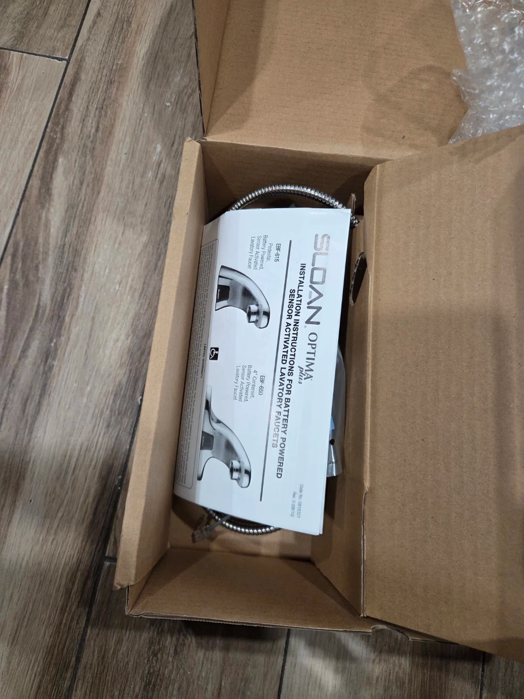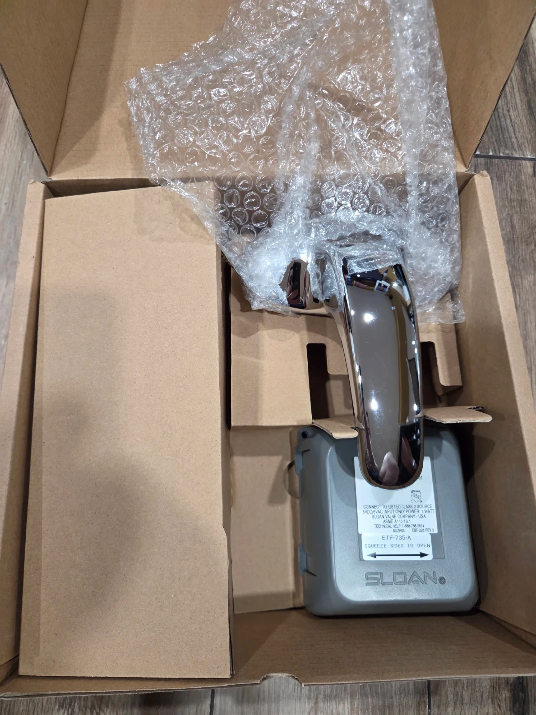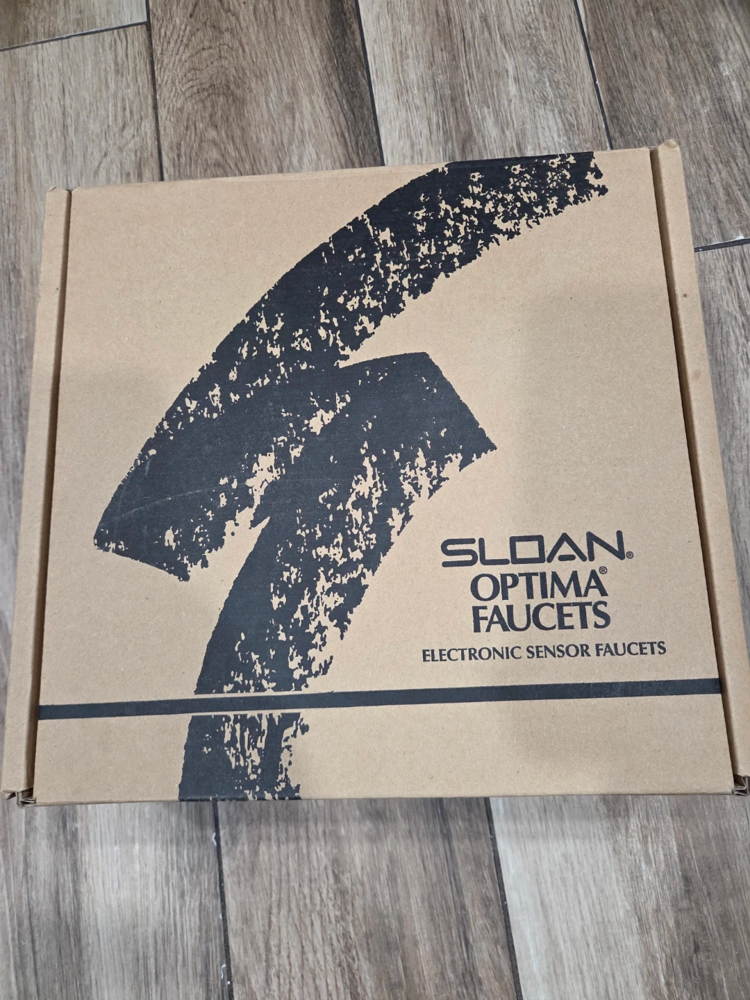 This is a new Sloan Optima electronic sensor faucet kit. It includes the faucet, control box, and all necessary accessories for installation. The faucet is battery-powered.