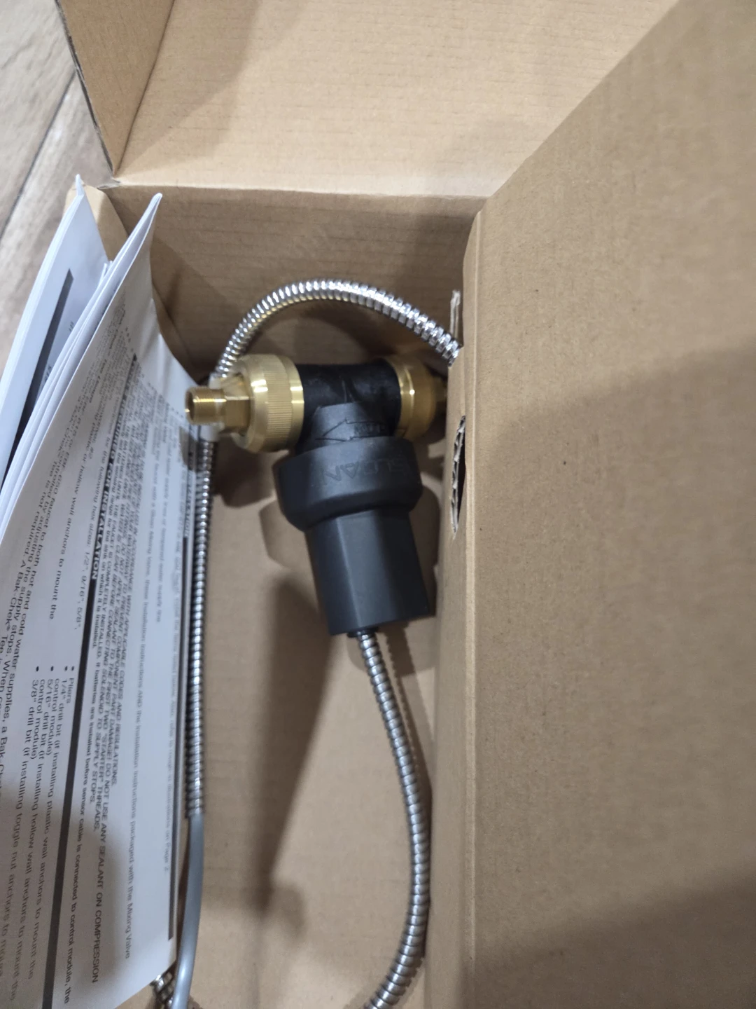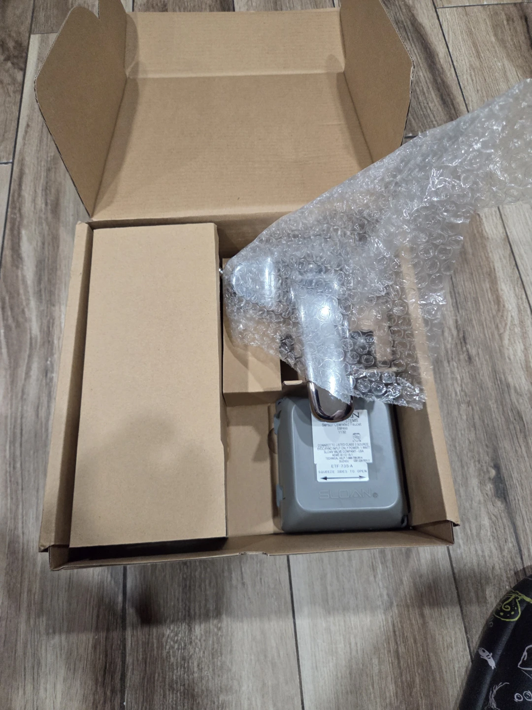 This is a new Sloan Optima electronic sensor faucet kit. It includes the faucet, control box, and all necessary accessories for installation. The faucet is battery-powered.