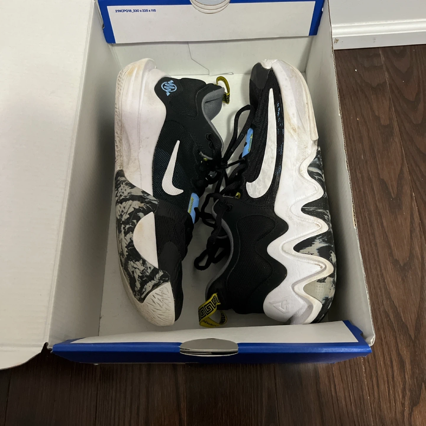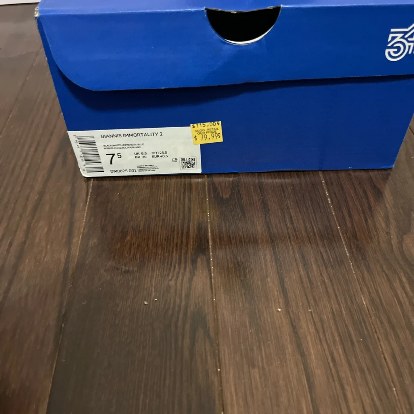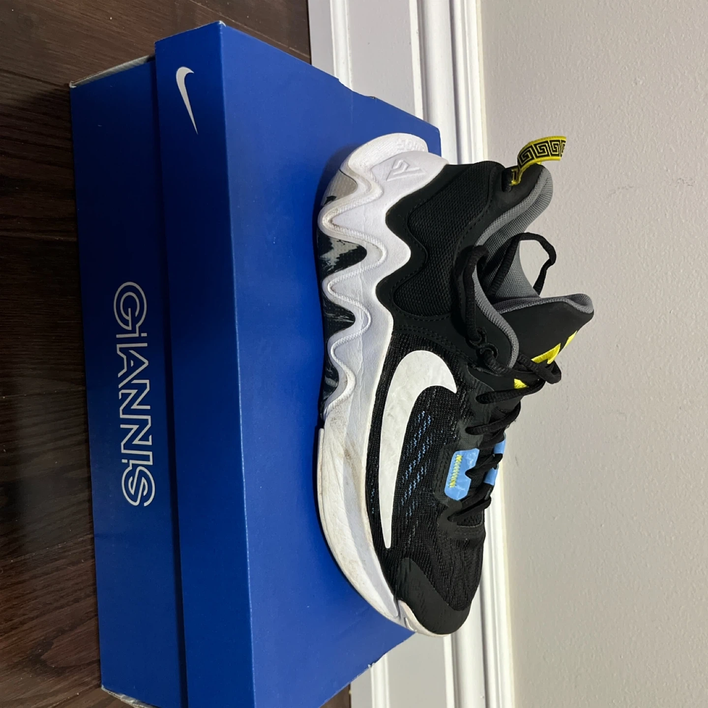 Nike Giannis Immortality 2 basketball shoes in black, white, and blue. Size US 7.5 (UK 6.5, EUR 40.5). Includes original box.