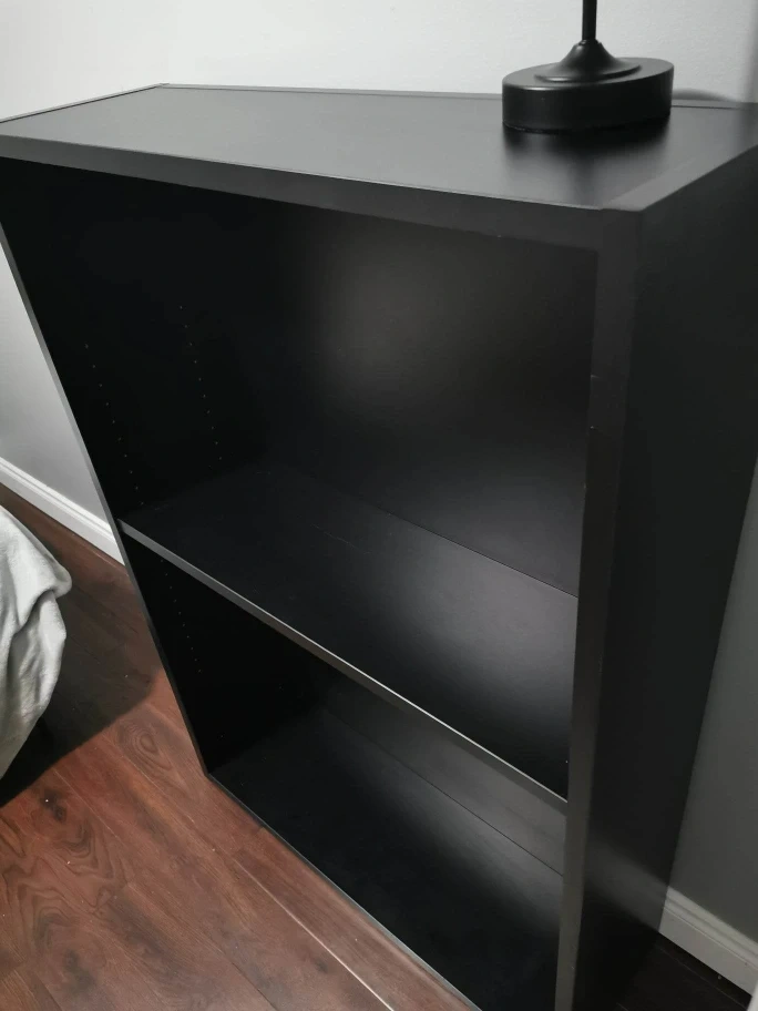 The shelf is solid wood (real wood!) so it is very sturdy. The middle shelf is adjustable. You can also turn it on its side and it makes a good headboard or footboard for a double bed (This is what I used it for. See photo.) Near-mint condition. 52" tall, 36" wide, 12" deep