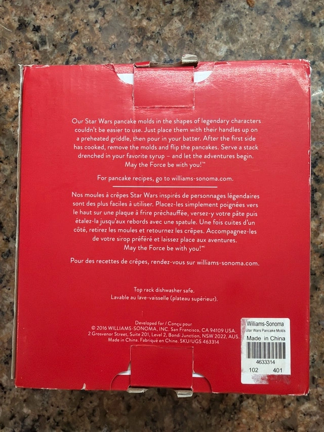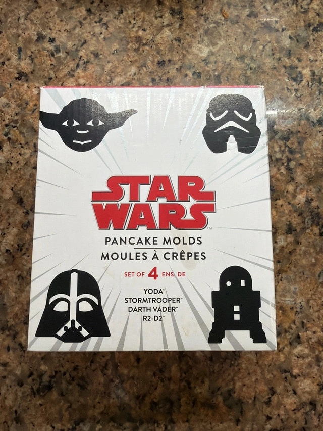 Get ready to flip over these Williams Sonoma Star Wars pancake molds! This set of 4 pancake molds are shaped like Yoda, a Stormtrooper, Darth Vader, and R2-D2 to bring the force to your breakfast table! These moulds have an innovative nonstick silicone design, with handles to make removal easy from a hot griddle and fold down for easy storage. Specifications: - Set of 4 moulds - Shapes: Yoda, Stormtrooper, Darth Vader, and R2-D2 - Material: Silicone - Brand new in original box. The going rate for these is about $30 CAD. If you're reading this, then yes, it's still available!