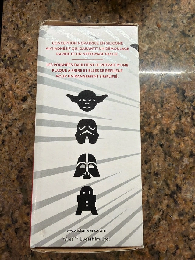 Get ready to flip over these Williams Sonoma Star Wars pancake molds! This set of 4 pancake molds are shaped like Yoda, a Stormtrooper, Darth Vader, and R2-D2 to bring the force to your breakfast table! These moulds have an innovative nonstick silicone design, with handles to make removal easy from a hot griddle and fold down for easy storage. Specifications: - Set of 4 moulds - Shapes: Yoda, Stormtrooper, Darth Vader, and R2-D2 - Material: Silicone - Brand new in original box. The going rate for these is about $30 CAD. If you're reading this, then yes, it's still available!
