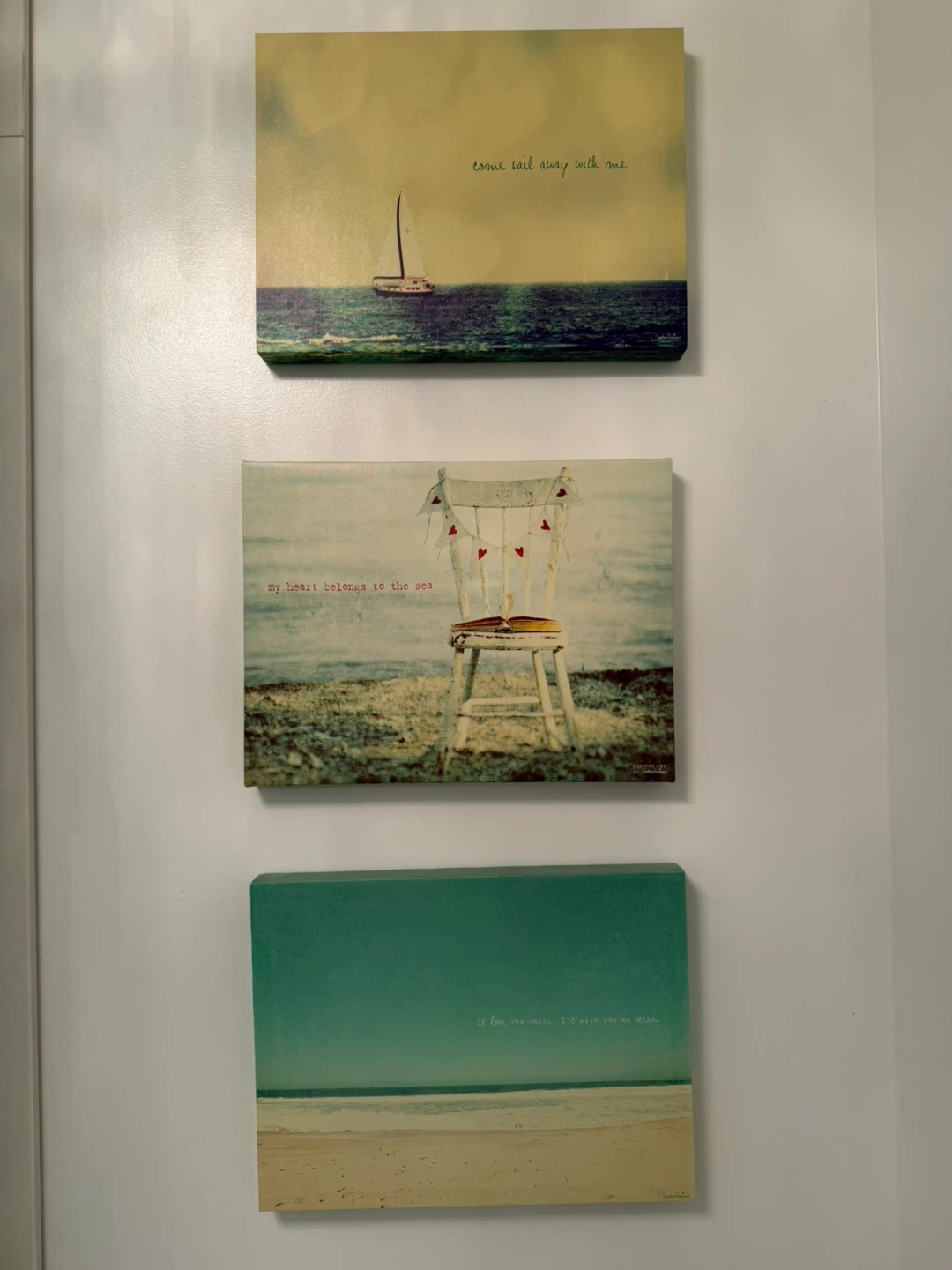 This set includes three canvas art prints featuring coastal scenes. One print has a sailboat with the text 'come sail away with me'. Another features a chair on the beach with the text 'my heart belongs to the sea'. The third print shows a beach and ocean with the text 'If four was water, I'd give you an ocean'. Porch pick up east York in Greektown