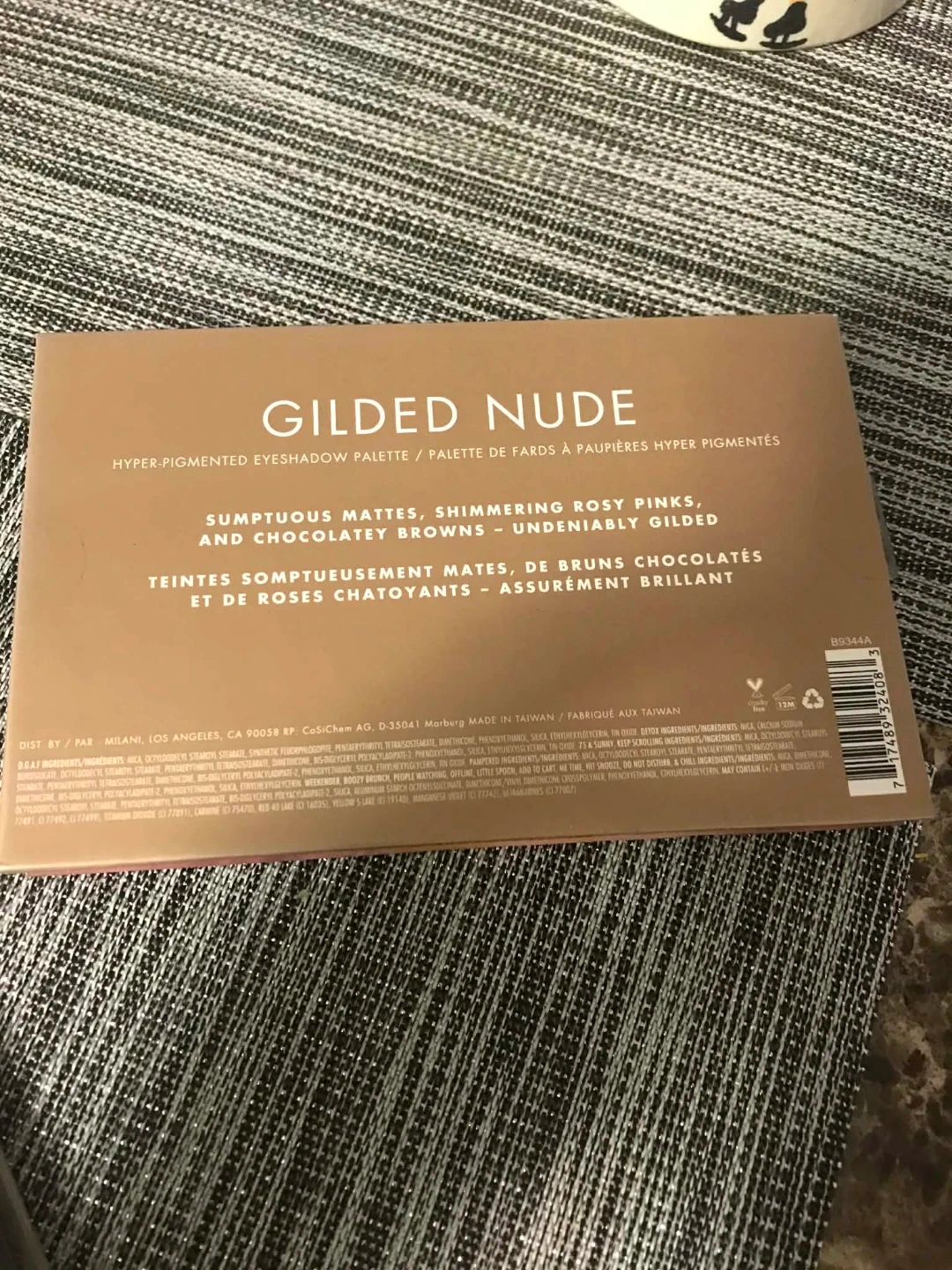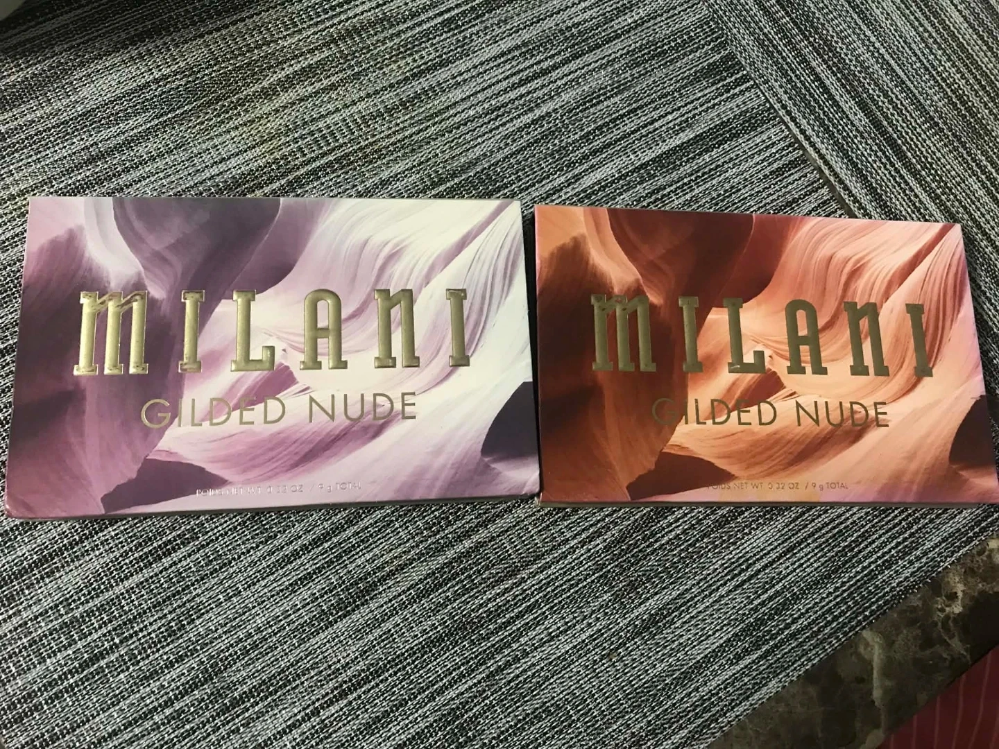 Two Milani Gilded Nude hyper-pigmented eyeshadow palettes. Each palette contains 15 shades of mattes and shimmers in rosy pinks and chocolatey browns. Each eyeshadow palette has a net weight of 0.22 oz / 9 g total. One color has a bit damage