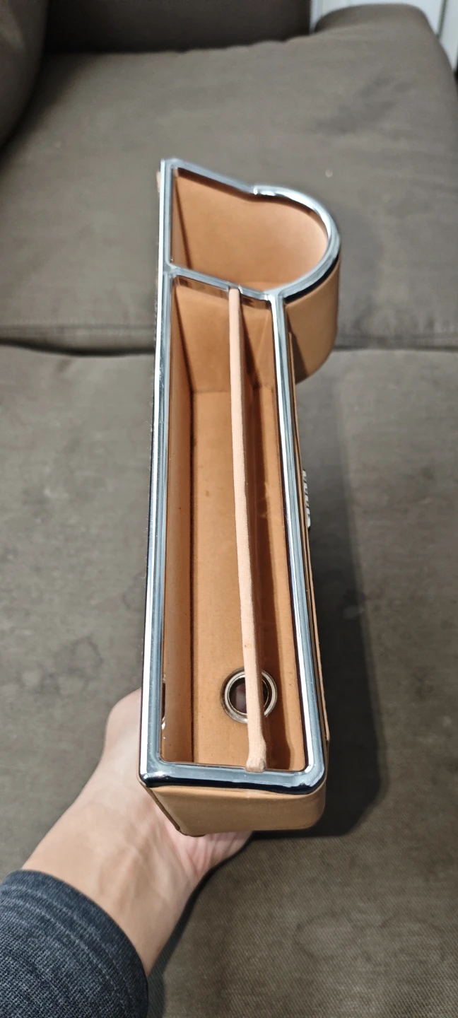 This car seat organizer is made from tan faux leather and features the Audi logo. It includes multiple compartments for storage and a cup holder. Perfect for keeping your car tidy!