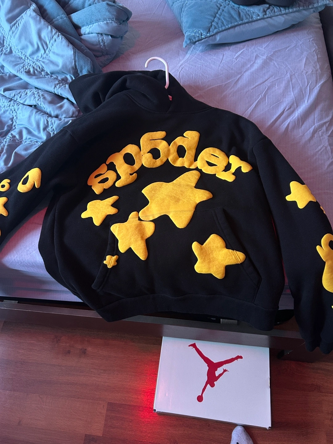Selling a Sp5der hoodie in black with yellow star designs. It's in great condition and ready for a new home! The hoodie features the 'Sp5der' logo across the chest and stars on the sleeves
