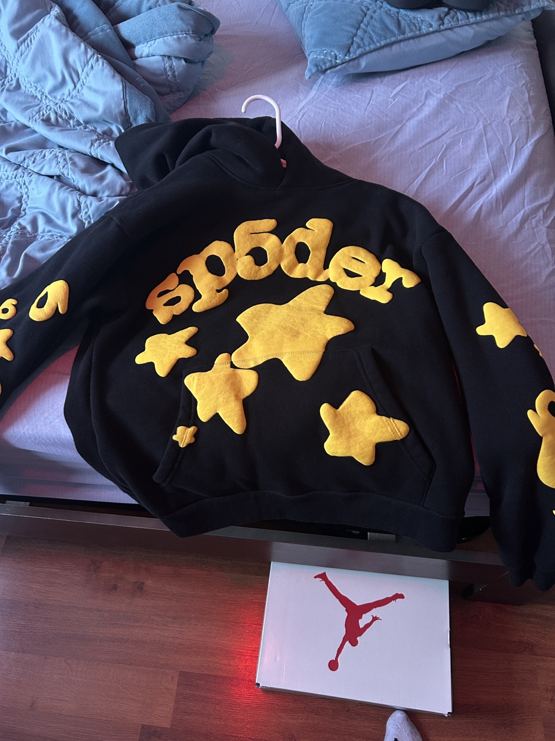 Selling a Sp5der hoodie in black with yellow star designs. It's in great condition and ready for a new home! The hoodie features the 'Sp5der' logo across the chest and stars on the sleeves