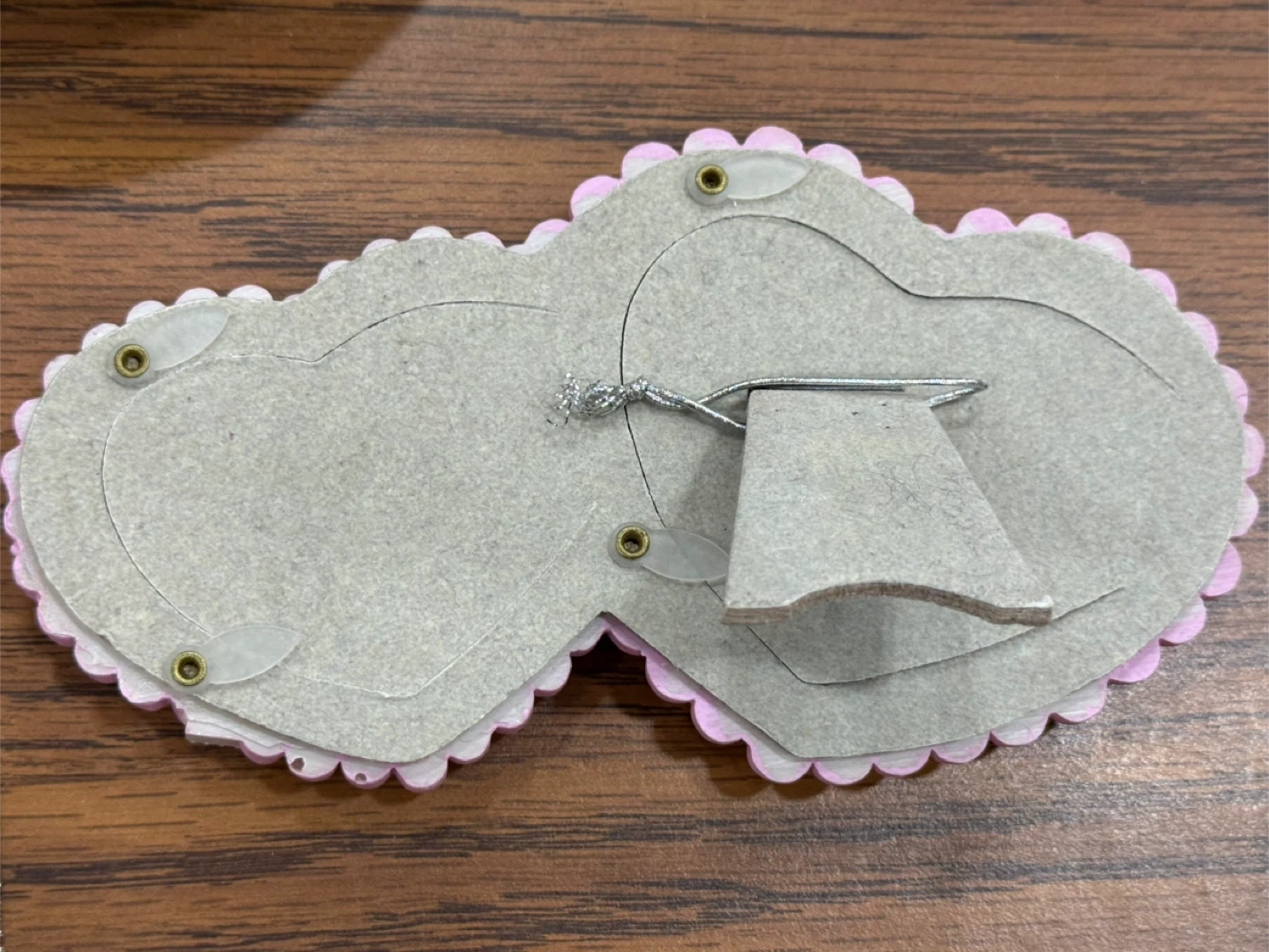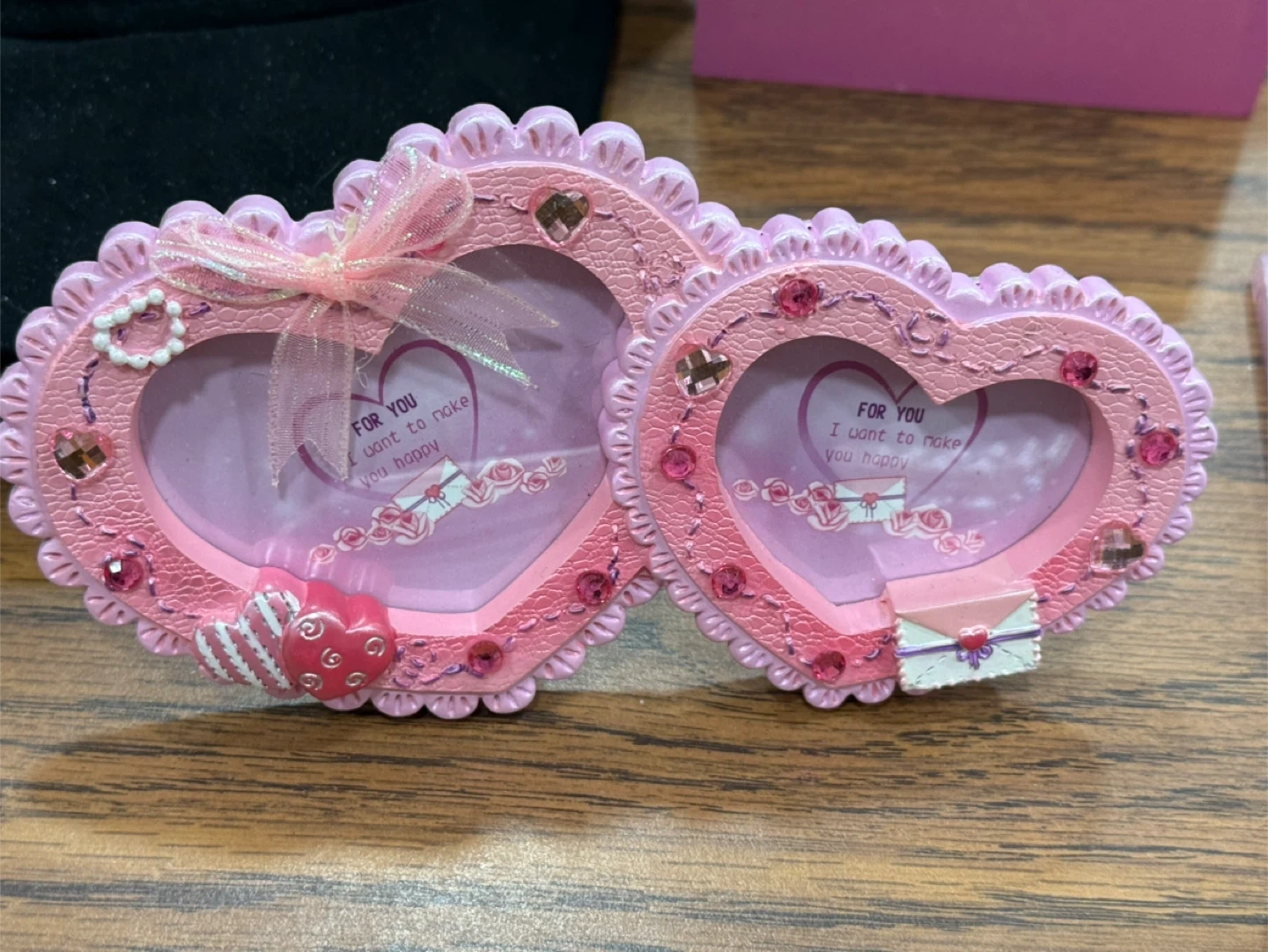 This is a cute pink double heart photo frame. It's decorated with tiny gems and a ribbon bow. It has a stand on the back for easy display.
