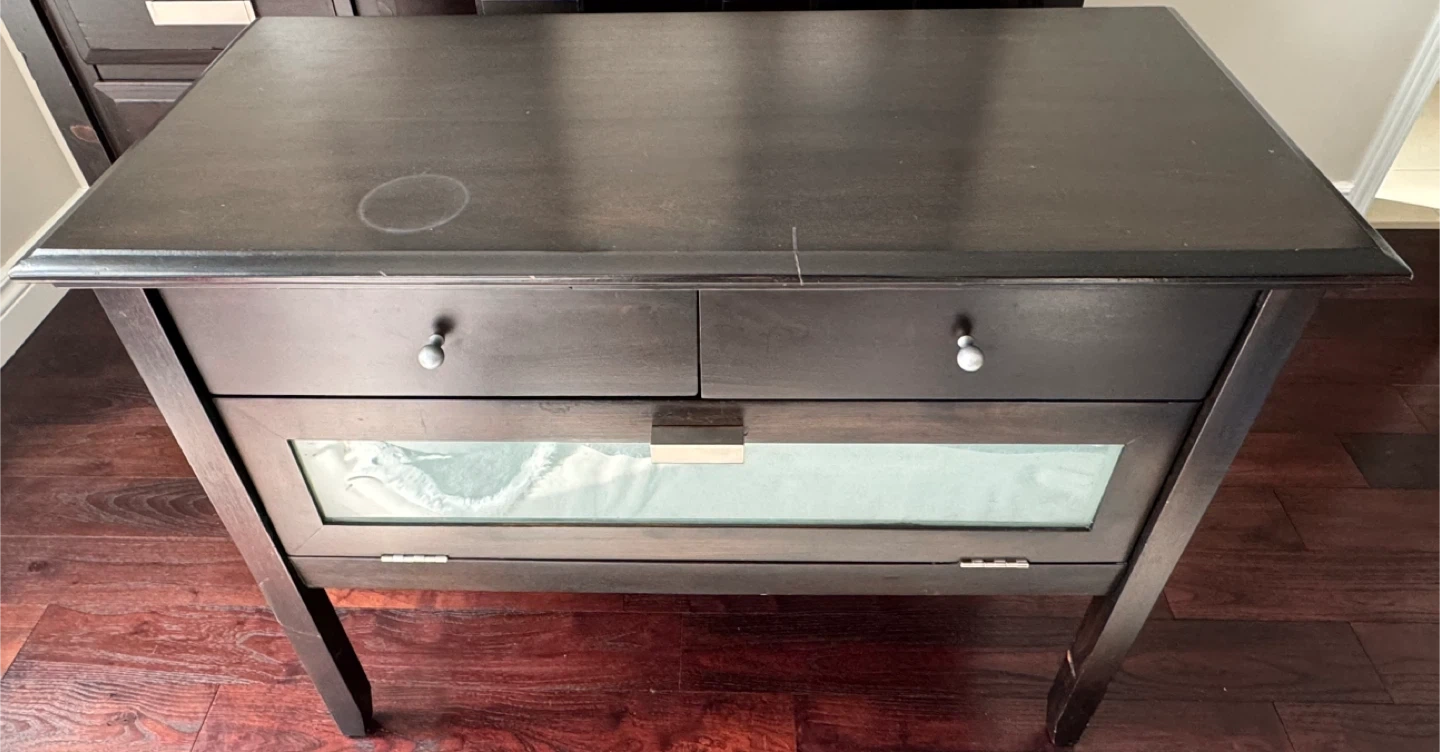 Wood and glass with metal handles
