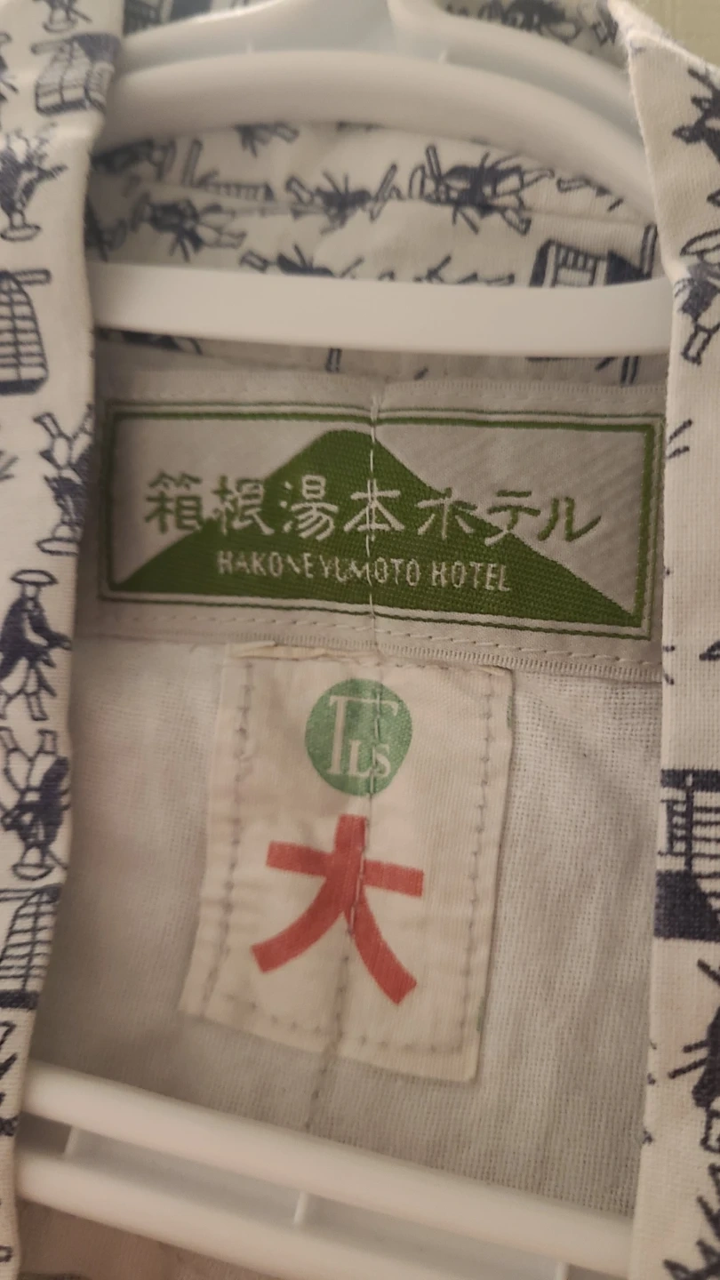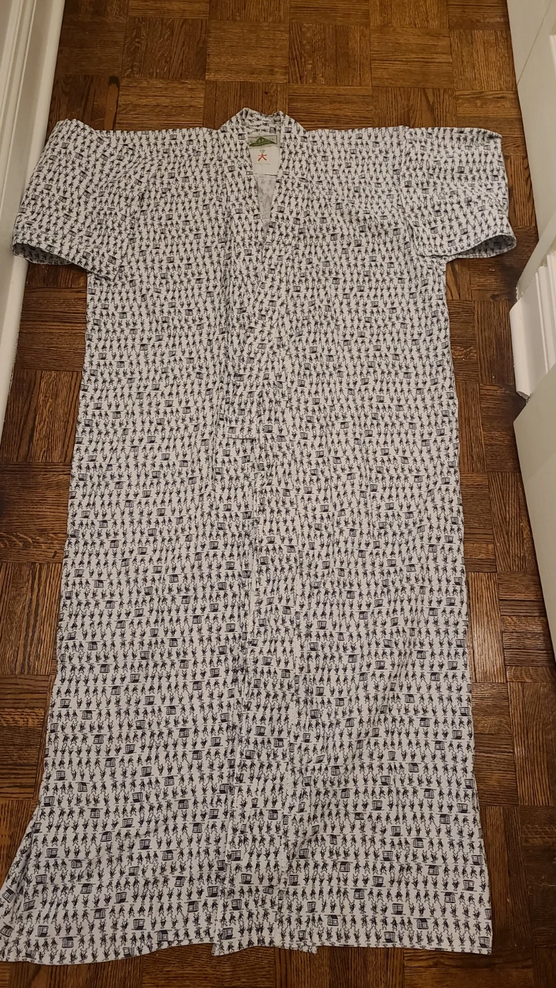 This is a traditional Japanese Kimono with a unique historical pattern. It comes with a matching red sash. Lightweight and comfortable for lounging.