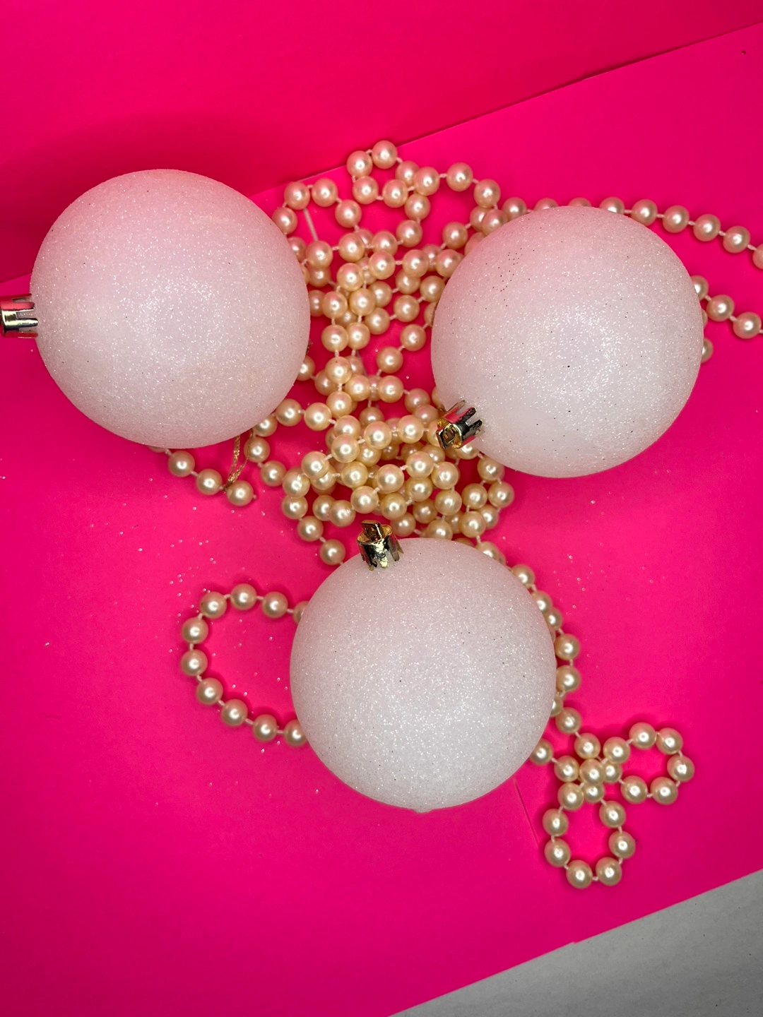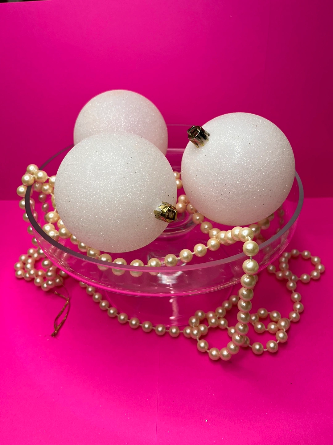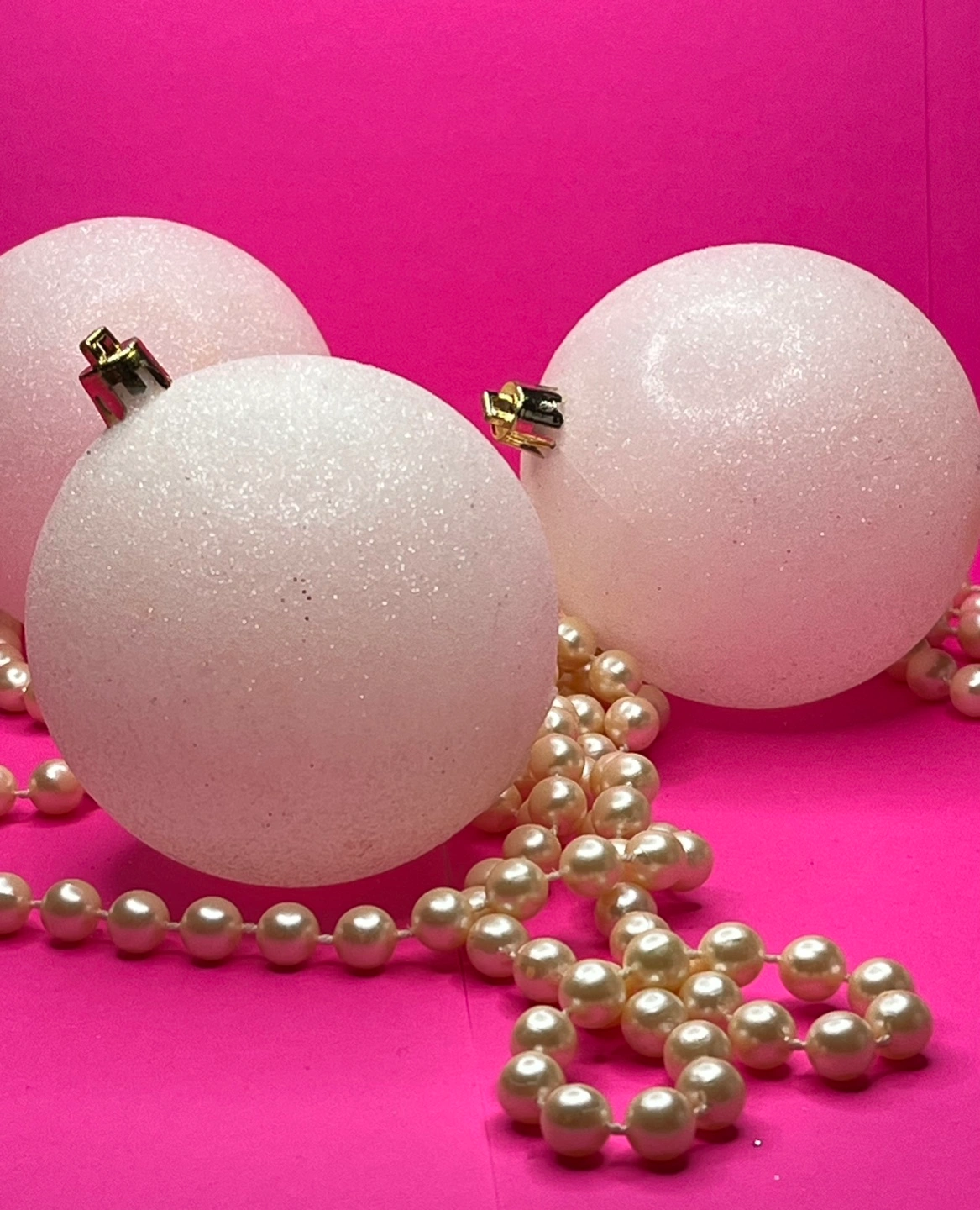 Set of three white glitter Christmas ornaments.