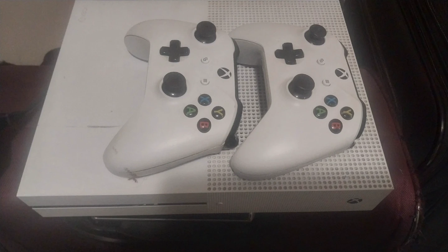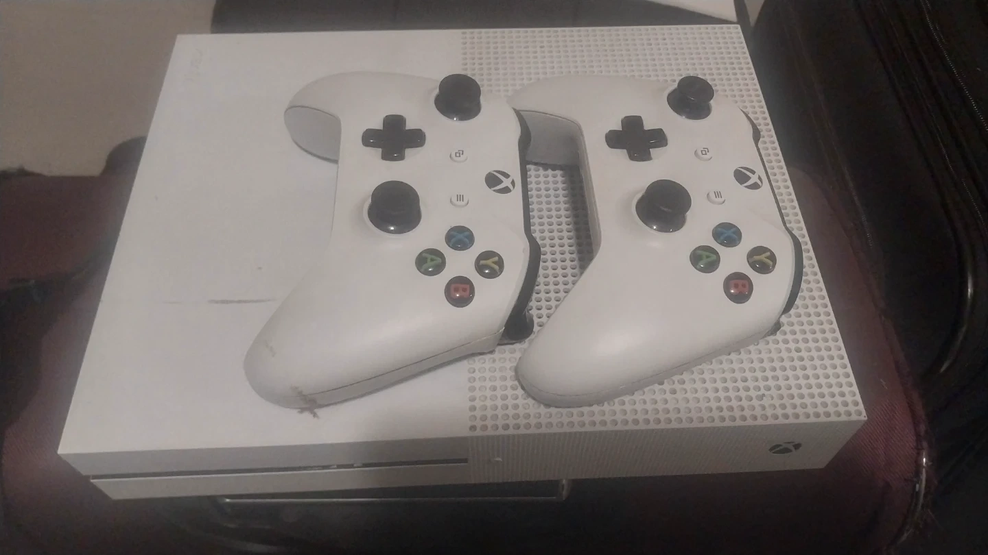 This is a white Xbox One S console. It comes with two white wireless controllers. Perfect for multiplayer gaming!