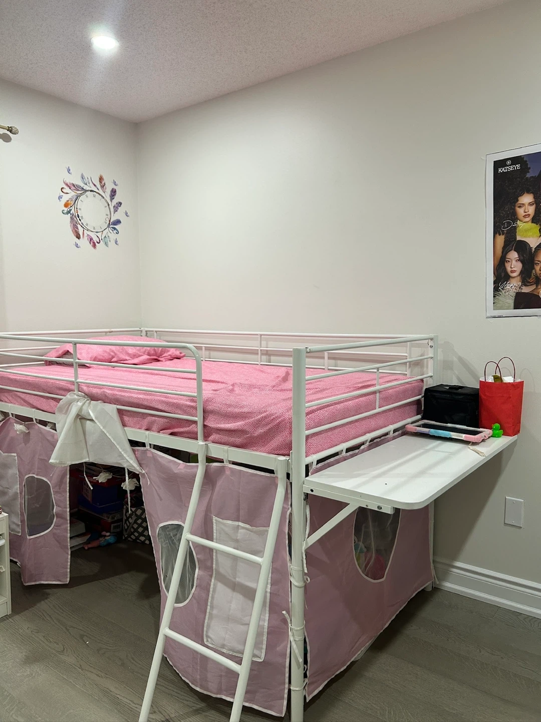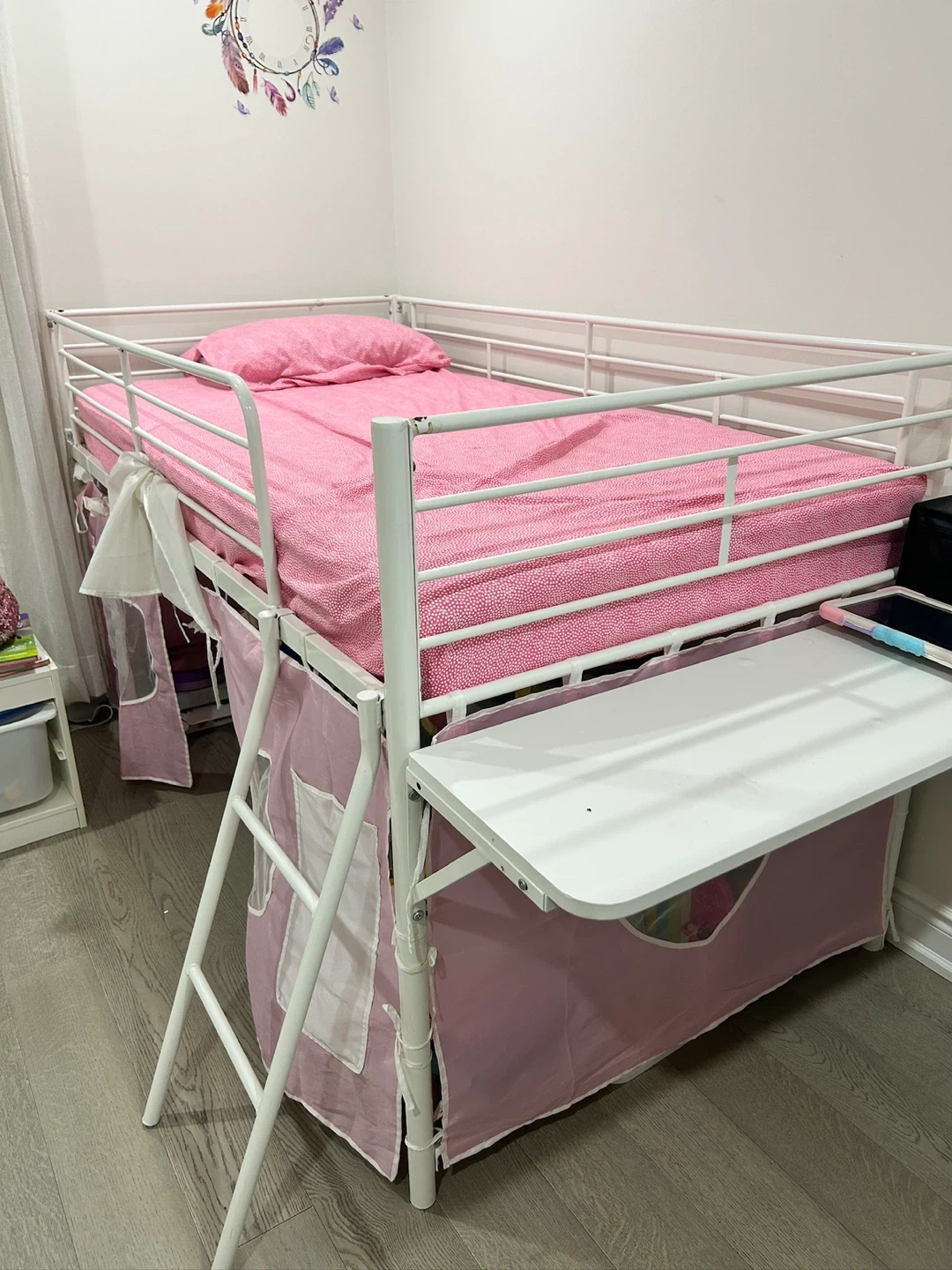 Selling an IKEA Småstad loft bed frame with a desk in excellent condition! This is perfect for a kid's room to save space and create a fun area for both sleep and study. The bed is white with pink accents, and the desk provides a handy surface for homework or creative projects. The ladder makes it easy to climb up to the cozy sleeping space! The bed also features a curtain to create a private space.