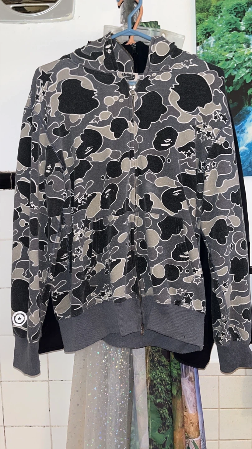 Selling a BAPE camo hoodie. It features a grey camouflage pattern with the BAPE logo on the hood and a tiger graphic on the sleeve. Great for adding a unique touch to your wardrobe!