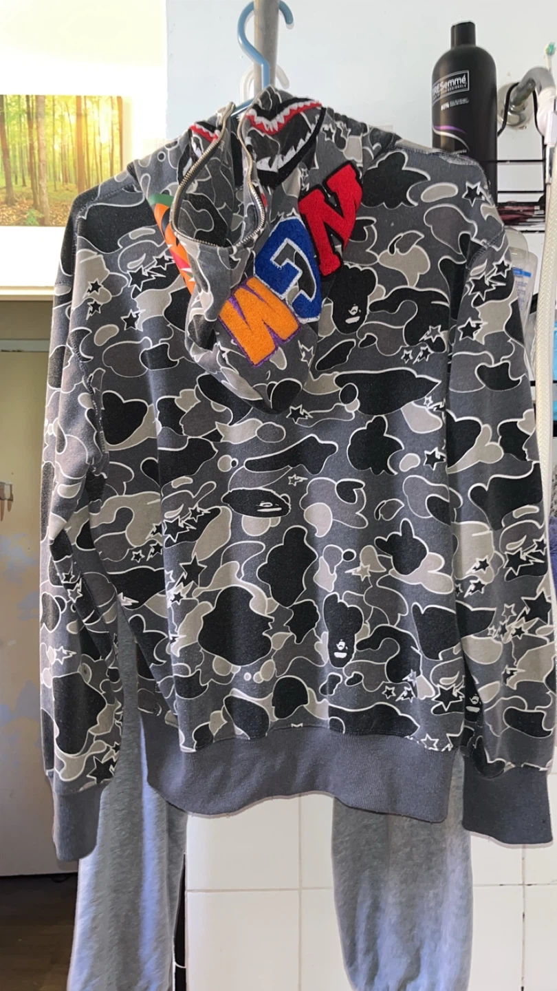 Selling a BAPE camo hoodie. It features a grey camouflage pattern with the BAPE logo on the hood and a tiger graphic on the sleeve. Great for adding a unique touch to your wardrobe!