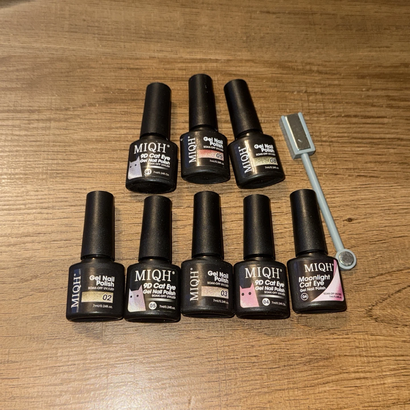 a set of 8 MIQH gel nail polishes! Includes various colours of 9D Cat Eye and Moonlight Cat Eye polishes. Also comes with a magnet to create cool effects. Each bottle contains 7ml/0.24 fl.oz of product
