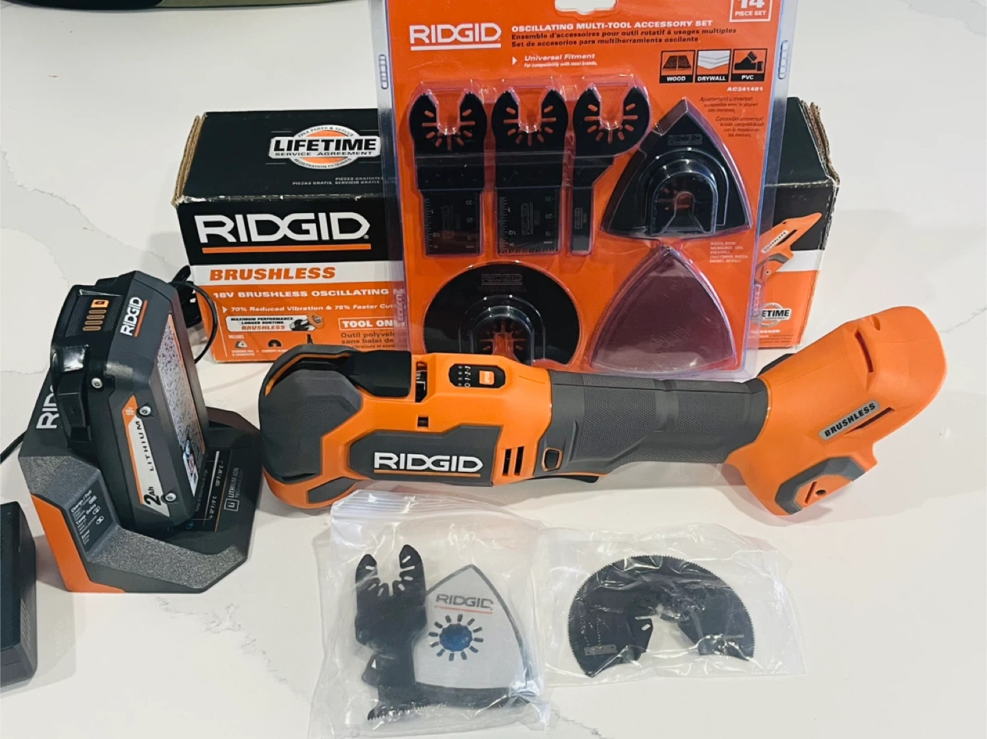 RIDGID 18V Brushless Cordless Multi-Tool with 2.0ah battery and charger and extra 14 piece accessory set