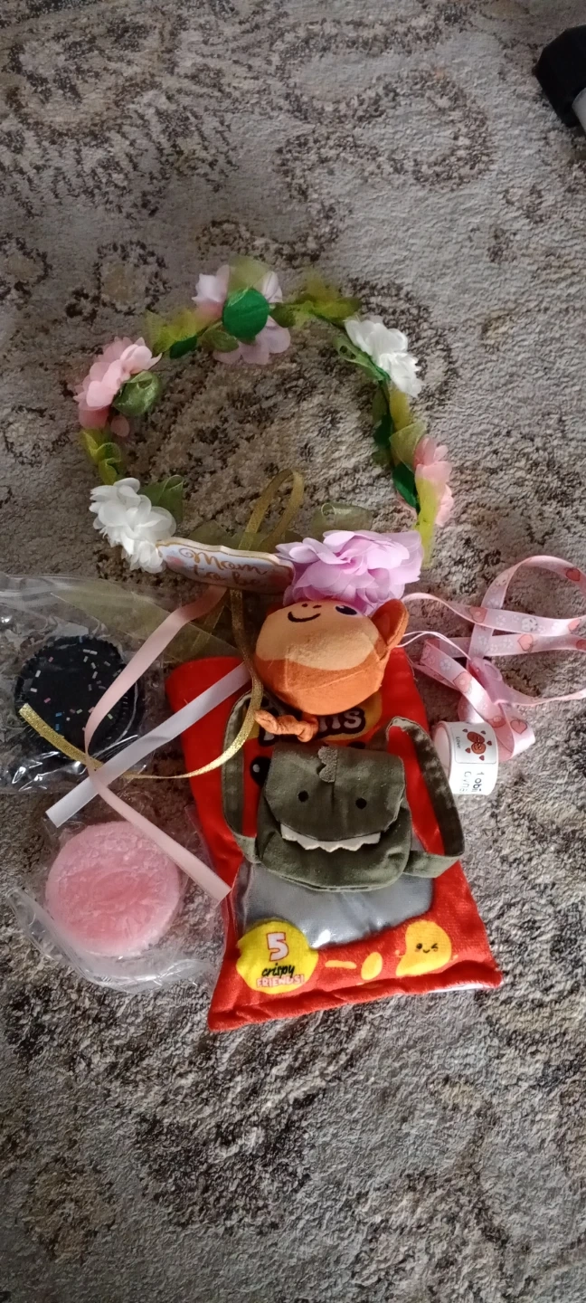 This set includes a floral crown with "Mom to be" ribbon and a plush toy with a backpack. It also has other small accessories, like ribbons and a pink puff.