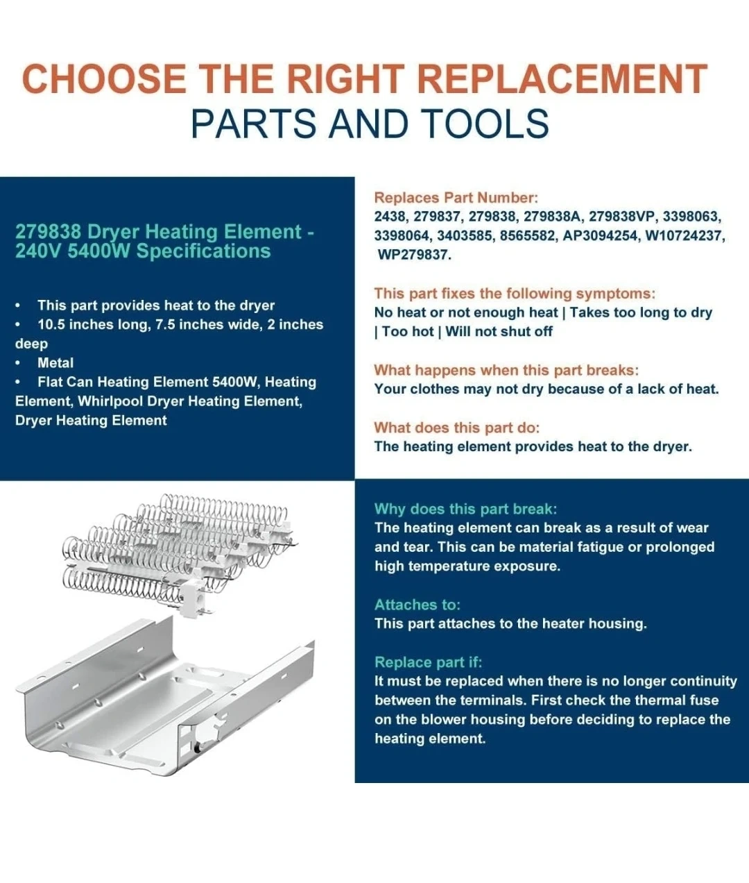 I'm selling a Seentech 279838 dryer heating element assembly. It's compatible with Whirlpool and Kenmore electric dryers. This part provides heat to the dryer and replaces part numbers 2438, 279837, 279838A, 279838VP, 3398063, 3398064, 3403585, 8565582, AP3094254, W10724237, and WP279837.